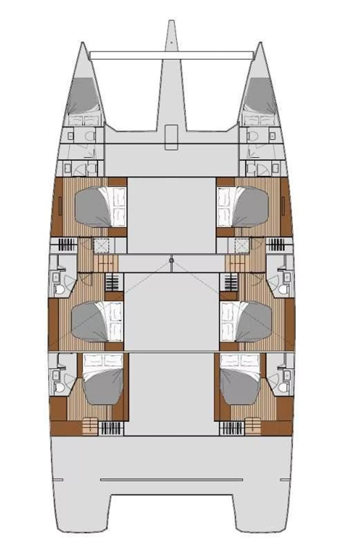 Below deck, five beautifully appointed guest cabins offer private sanctuaries for up to ten guests, each featuring en-suite bathrooms and soft, luxurious finishes.