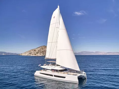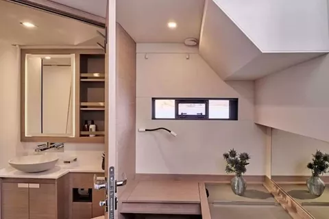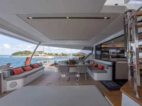 Her impressive beam creates expansive outdoor living spaces, perfect for long, laughter-filled lunches or sunset cocktails beneath the sails. Step inside, and the sense of space continues. The interior offers modern sophistication, with wide, light-filled lounge and galley framed by panoramic windows that keep the ocean always in view.