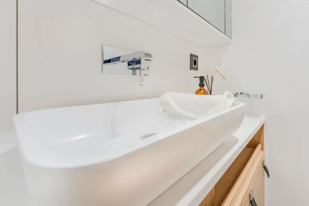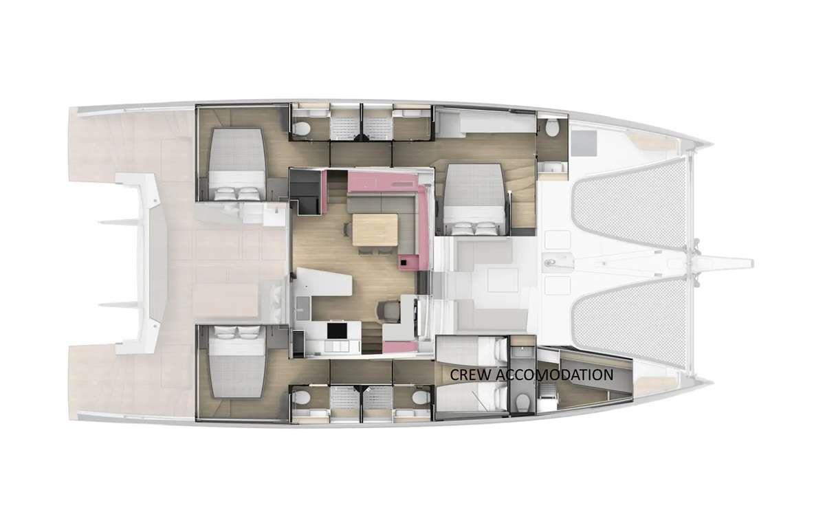 The Privilège catamaran features three spacious queen cabins, each with en-suite bathrooms, accommodating up to 6 guests in ultimate comfort and privacy.