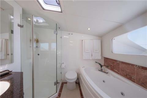King's Ransom features a main-deck, king-berth, master suite, and 4 queen berth guest suites. The midships starboard queen suite may be converted into two twin berths.