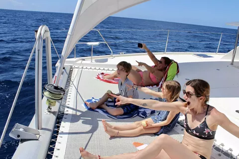 Groovy is a blue water sailing catamaran, built for safety and stability at sea. She’s equipped with snorkeling gear, floaties, fishing rods, two paddleboards, and a wing foil. The crew are passionate and experienced water sports enthusiasts — skilled in kite surfing, foiling, and diving — and enjoy guiding and teaching guests who are eager to try something new or improve their confidence on the water.