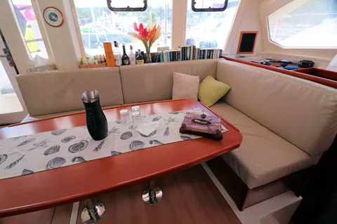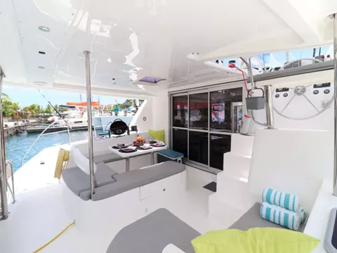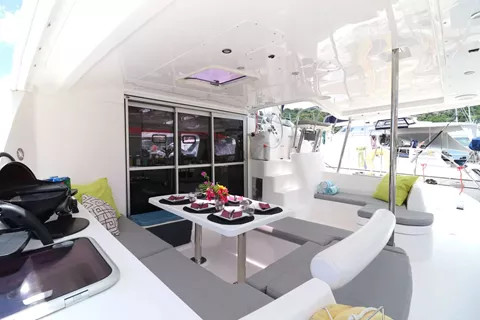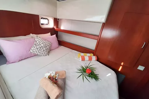 Groovy offers exceptional comfort with a shaded forward cockpit perfect for afternoon cocktails, a bow trampoline for sunbathing, and a spacious aft cockpit for relaxed dining. Inside, the open-plan saloon is bright and breezy, blending seamlessly with the outdoor spaces. The boat offers three guest cabins, each with large windows that let in plenty of natural light and scenic views, along with air-conditioning, fans, and private en-suite bathrooms. Two cabins feature queen beds, while the third has a convertible bed that can be arranged as a twin or double — ideal for children or adults sharing.