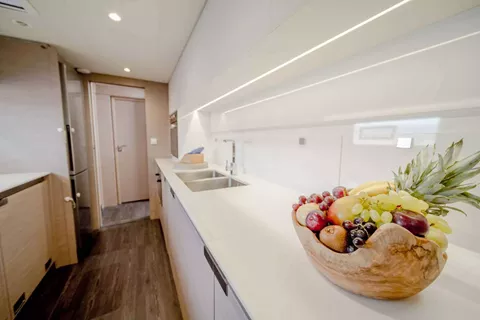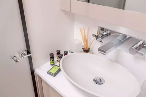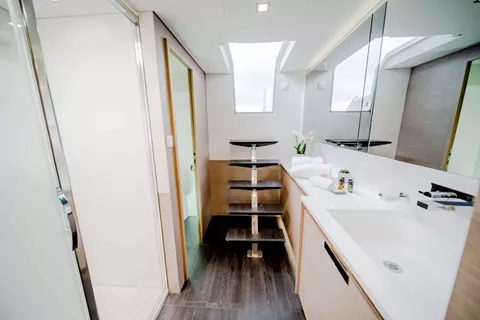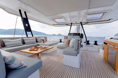 Every detail of Namaste has been carefully crafted to deliver both connection and tranquility. Her expansive 27.5m² aft cockpit sets the scene for relaxed dining and social gatherings, while the foredeck features modular sunbathing lounges, ideal for soaking up the sun or enjoying quiet moments under sail. The flybridge offers spectacular panoramic views — a perfect place for sunrise yoga, afternoon cocktails, or starlit dinners. Her bright and inviting main saloon, with access to both the aft and fore decks, enhances the feeling of openness and flow throughout the yacht. With a galley-down layout, guests enjoy a spacious and elegant living area designed for effortless comfort and togetherness.