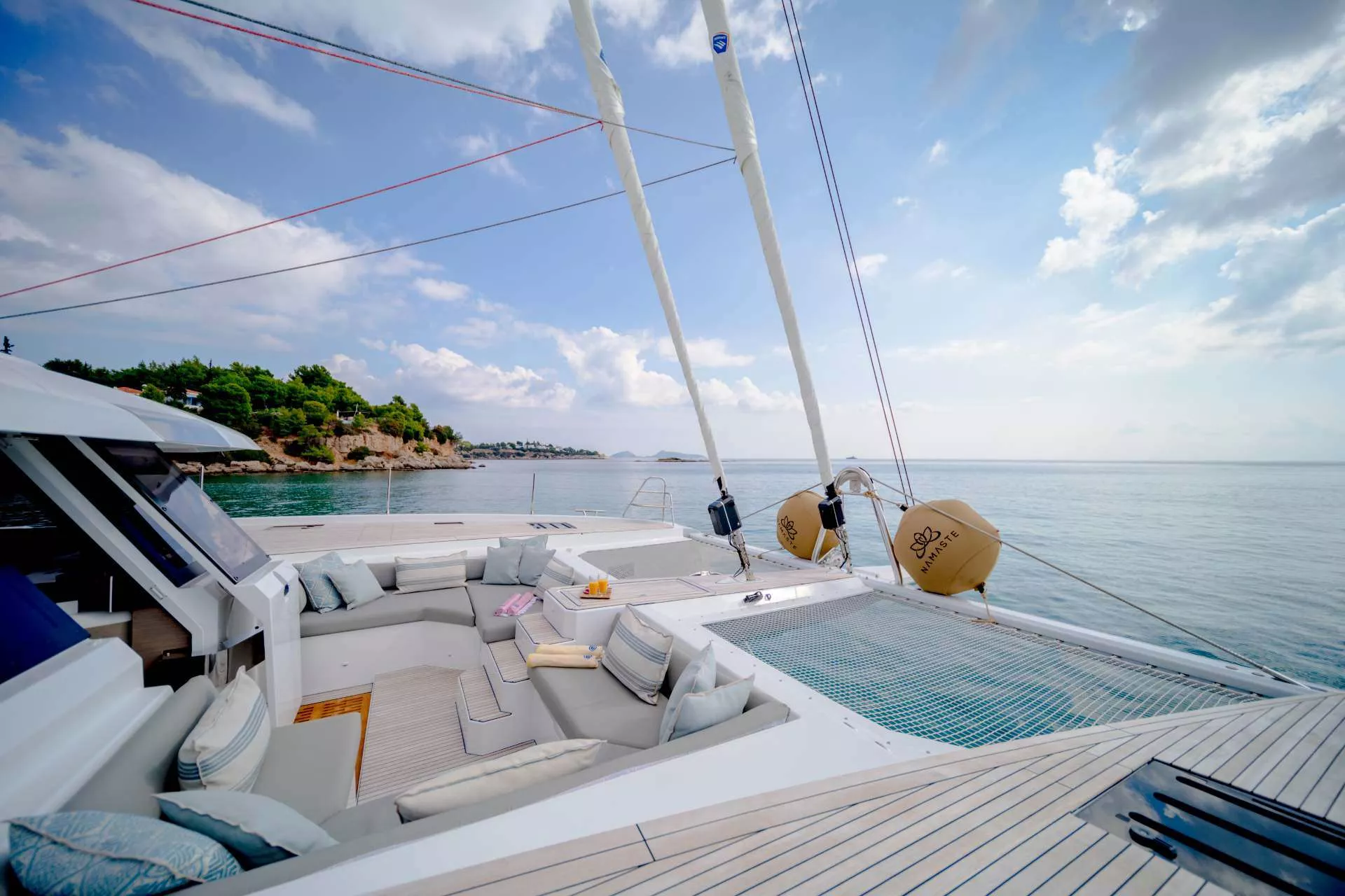 S/Y Namaste is a magnificent Fountaine Pajot Samana 59, designed to offer the perfect harmony of space, elegance, and freedom. With her breathtaking 30m² flybridge — the largest in her category — and her beautifully balanced blend of open social areas and private retreats, she invites guests to savor the art of living at sea in true French style.