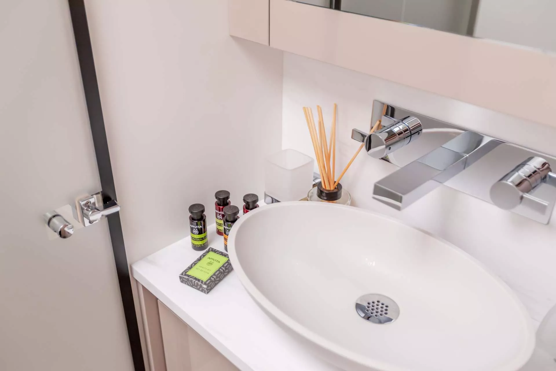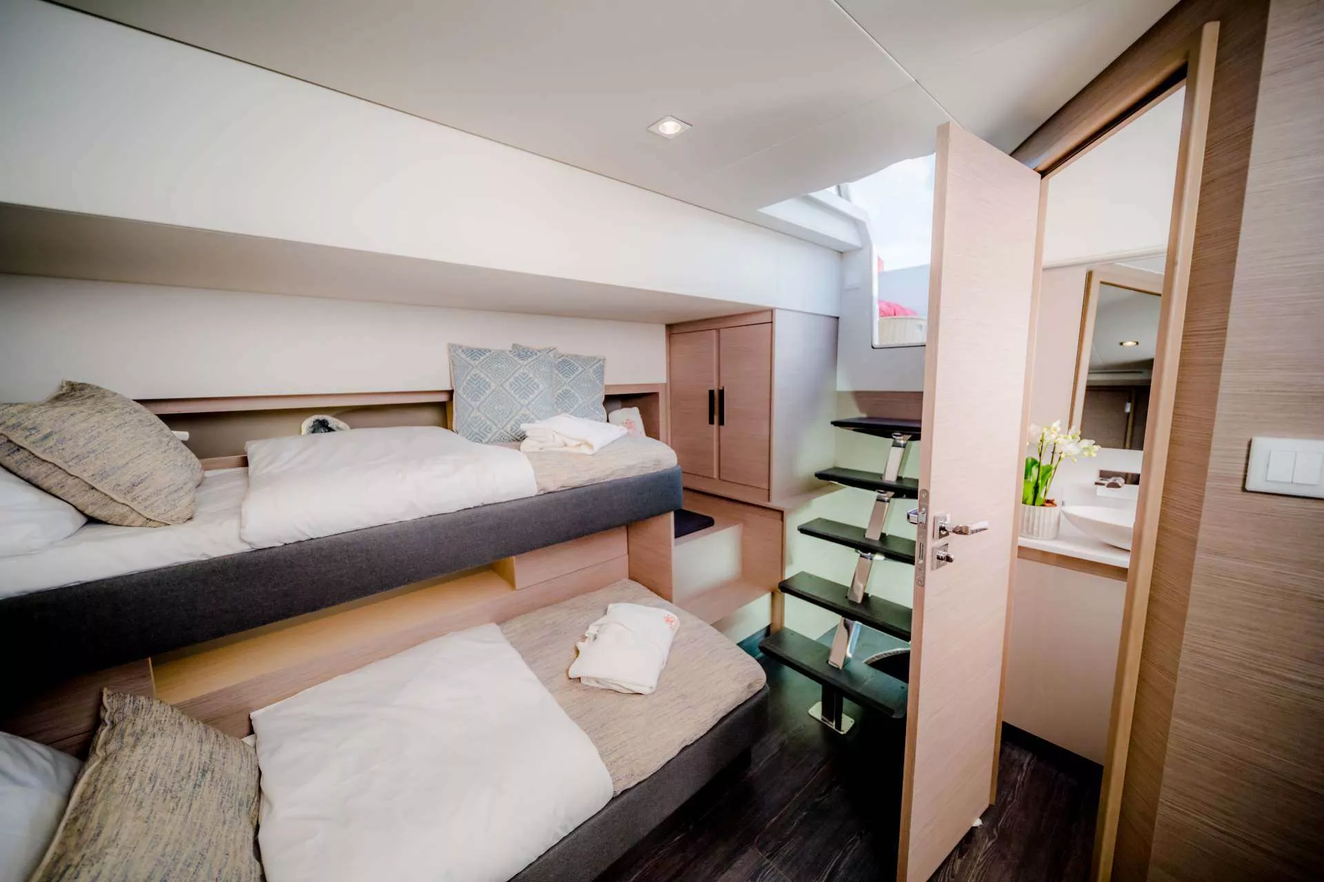Namaste accommodates up to 8 guests in four beautifully appointed cabins: A large master suite offering refined comfort and private access to the deck, two queen-bed cabins featuring contemporary design and en-suite bathrooms, and one twin cabin with bunk beds and deck access, ideal for families or children. Every cabin is designed to provide a peaceful sanctuary, blending natural light with refined finishes.