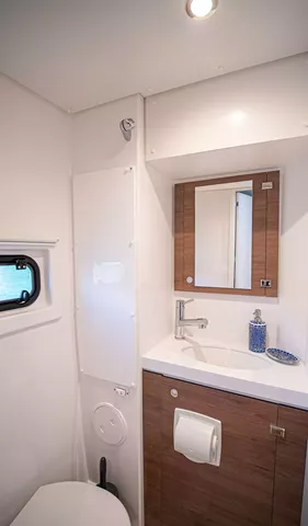The traditional forward trampolines have been replaced with a spacious lounge area outfitted with cushions for superior sunbathing and relaxation. A full-sized door connects this lounge area to the salon, ensuring effortless movement throughout the yacht. The flybridge features a seating area perfect for enjoying cocktails and sunsets, as well as a sunbathing spot offering panoramic views from the yacht’s highest point.