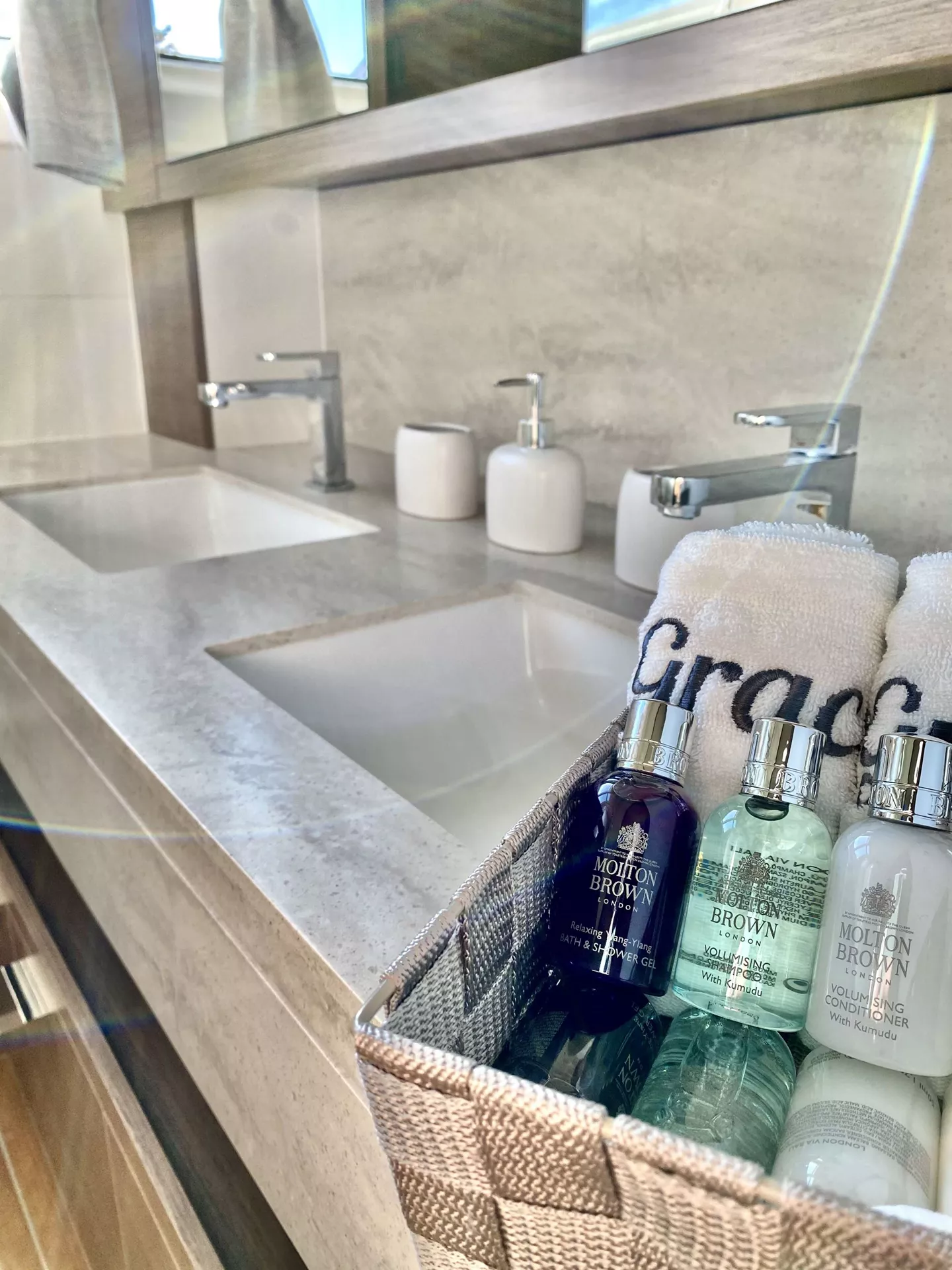 She accommodates 8 guests in 4 large ensuite cabins. One master cabin with direct access to aft deck, one VIP cabin with direct access to aft deck and two queen bed quest cabins all with private bathrooms