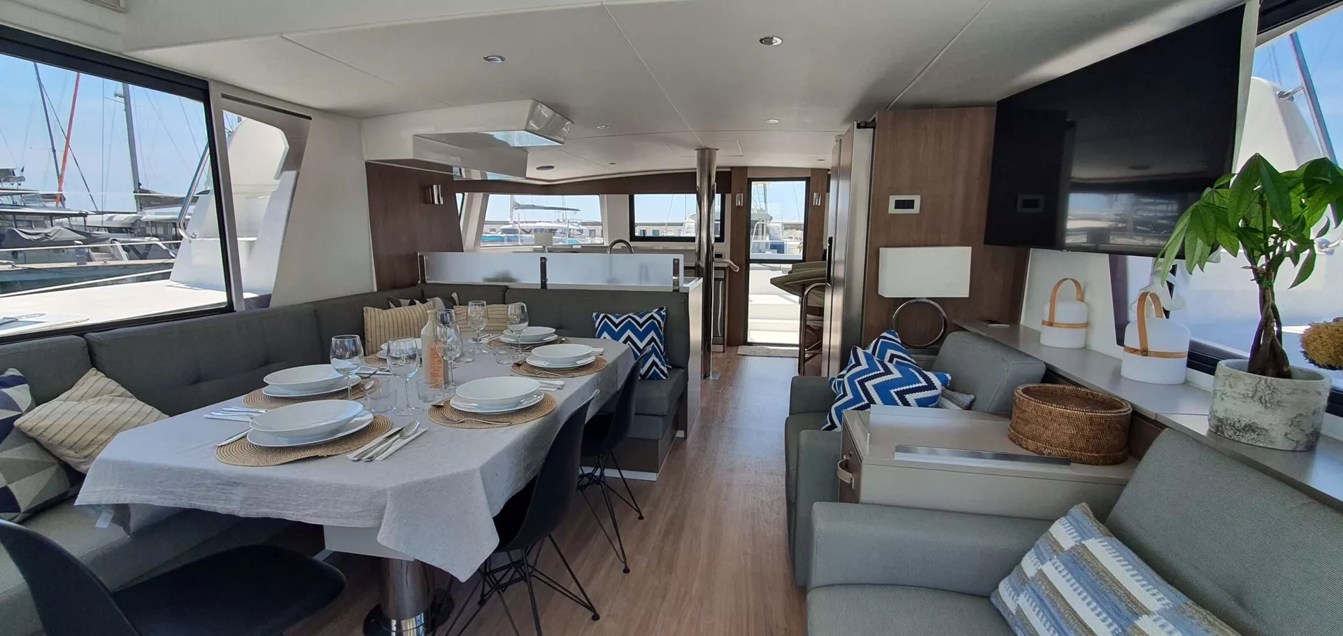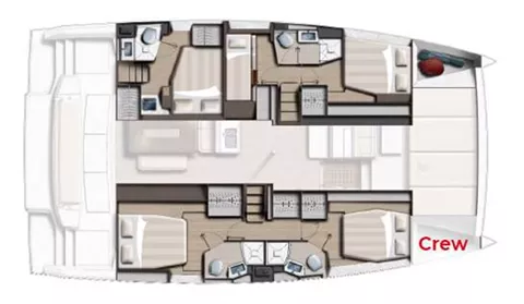 Guest cabins: 4 double cabins + 1 twin cabin + 4 WCsCrew cabin: 1 front peak + WC to share with guests