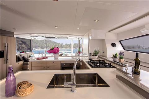 Huge salon with open space galley, exceptionally well equipped. Hydraulic opening of the aft part of the salon, connecting the salon with the cockpit.