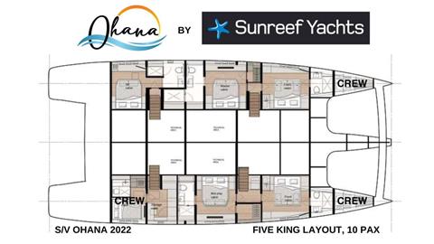 Ohana sleeps up to ten guests in five deluxe, king-size ensuite cabins. The king beds are all floor-level berths with full-walk around access. Each cabin boasts a mirror-covered wall to allow for maximum light during the day and lend an airy vibe to the comfortable cabins.