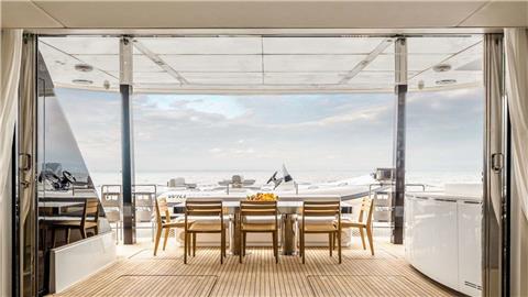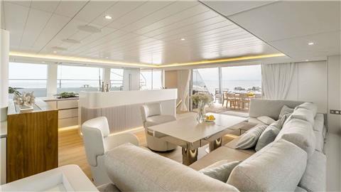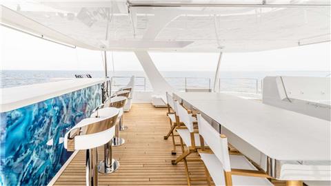 A vast, central lounging space with a panoramic view opens both onto the bow terrace and cockpit. The bow benefits from a cozy lounge, well shielded from sun and wind. To the aft, the saloon merges with the spacious cockpit offering a lovely al fresco dining area. The cockpit overlooks an extra large hydraulic platform that can act as a swim-up island once the jet tender is splashed. From the aft bathing platform, you can launch water toys, try scuba diving for the first time or sun tan all at sea-level. All the areas combined form a universal, open environment where flexibility and freedom reign.