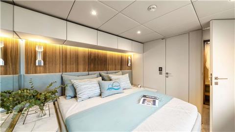 The hulls provide impressive volumes to this large yacht. Airy, luxurious guest cabins encompass king-size beds, roomy closets and storage spaces, retractable TV and an immense bathroom. A perfect setting to unwind and relax after a long day in the sun.