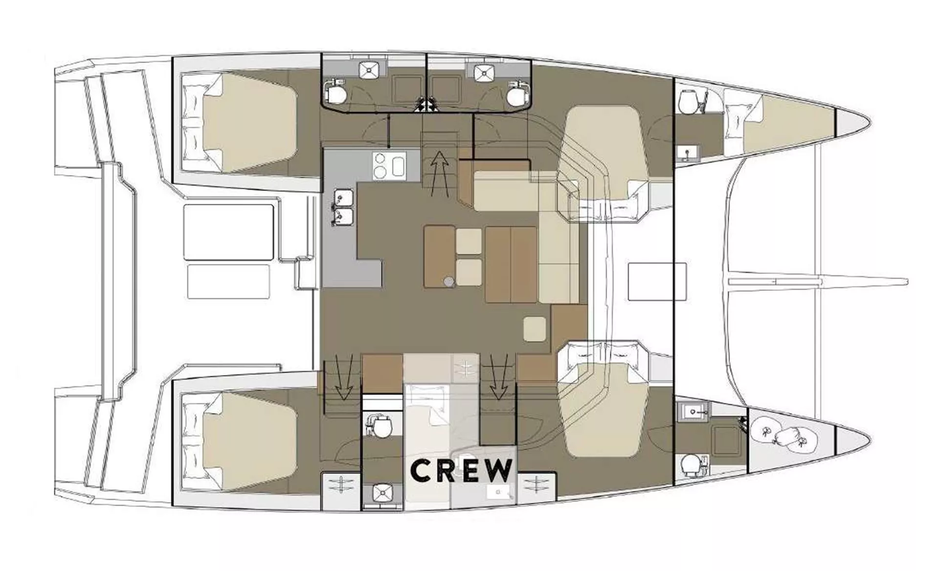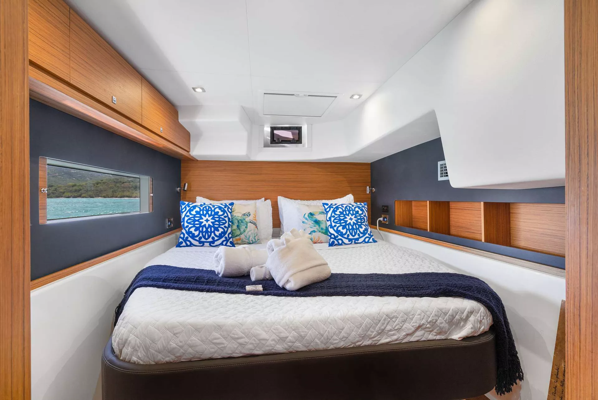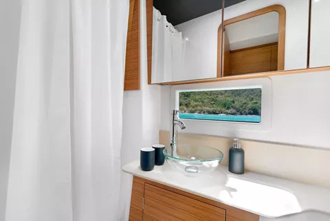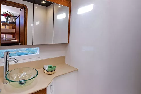 Below decks, four queen cabins each enjoy private dual-entry access from port and starboard, ensuring maximum guest privacy. Every stateroom boasts its own ensuite with separate shower, generous storage, and thoughtfully placed portlights for excellent ventilation and brightness—creating serene retreats for restorative nights at sea.