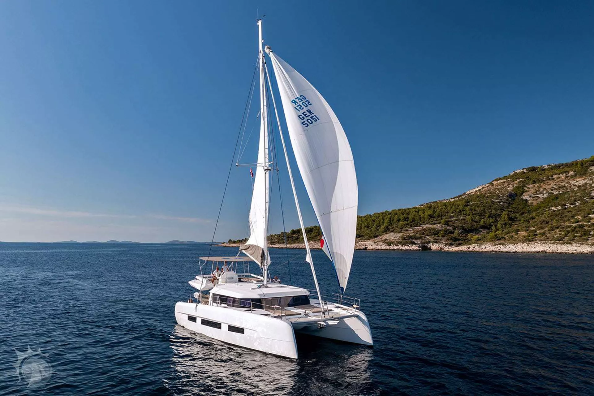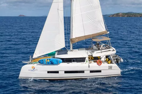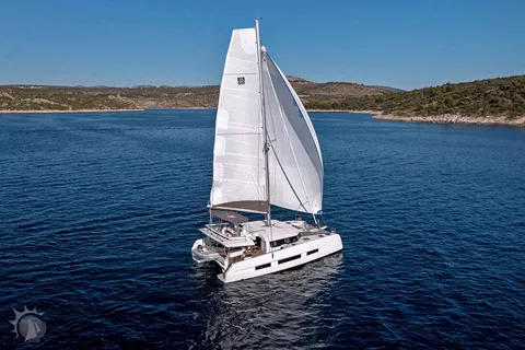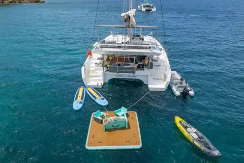 Step aboard the 2023 48-foot Dufour Catamaran, thoughtfully designed to host up to eight guests in four queen cabins. Its perfectly balanced layout—dividing the deck plan, cockpit, flybridge, and foredeck into equal thirds—creates a harmonious flow between indoor and outdoor living in every season. At the bow, two expansive sunbathing areas offer prime spots for soaking up warm rays and gentle sea breezes.