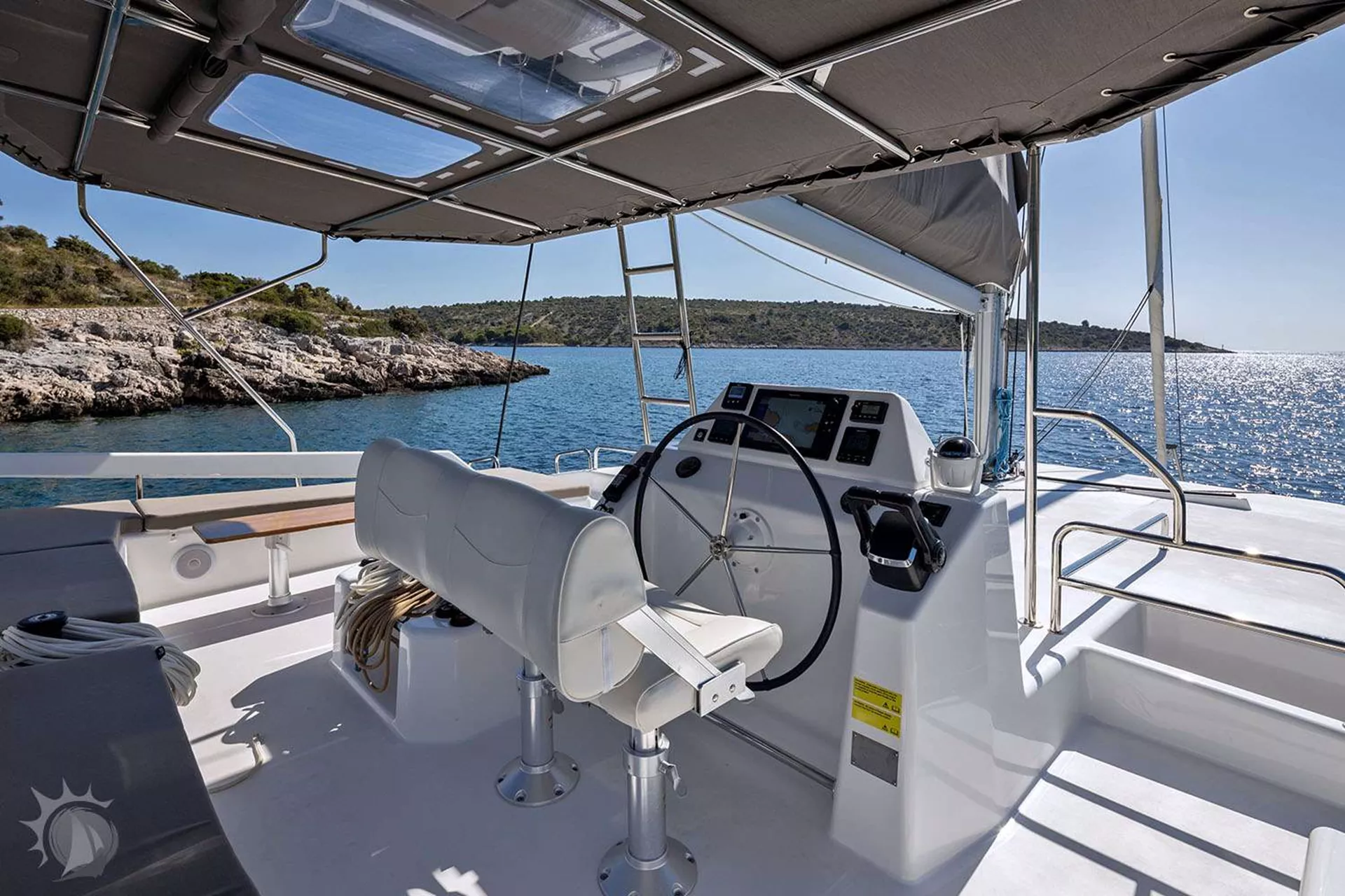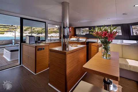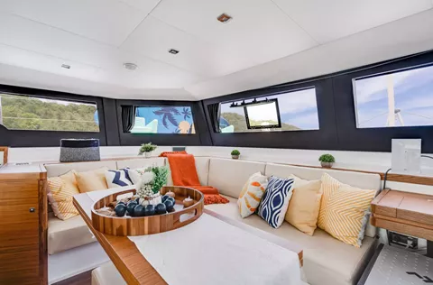 Inside, the open-plan salon invites convivial gatherings beneath a 360° sea-facing panorama, while the fully equipped, ergonomic galley flows naturally towards the cockpit. A versatile sofa-dining unit adapts from cozy lounge to elegant table or even an extra double berth, and wide wraparound windows bathe the interior in warm daylight.