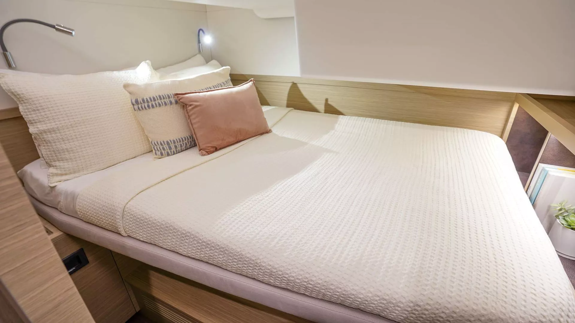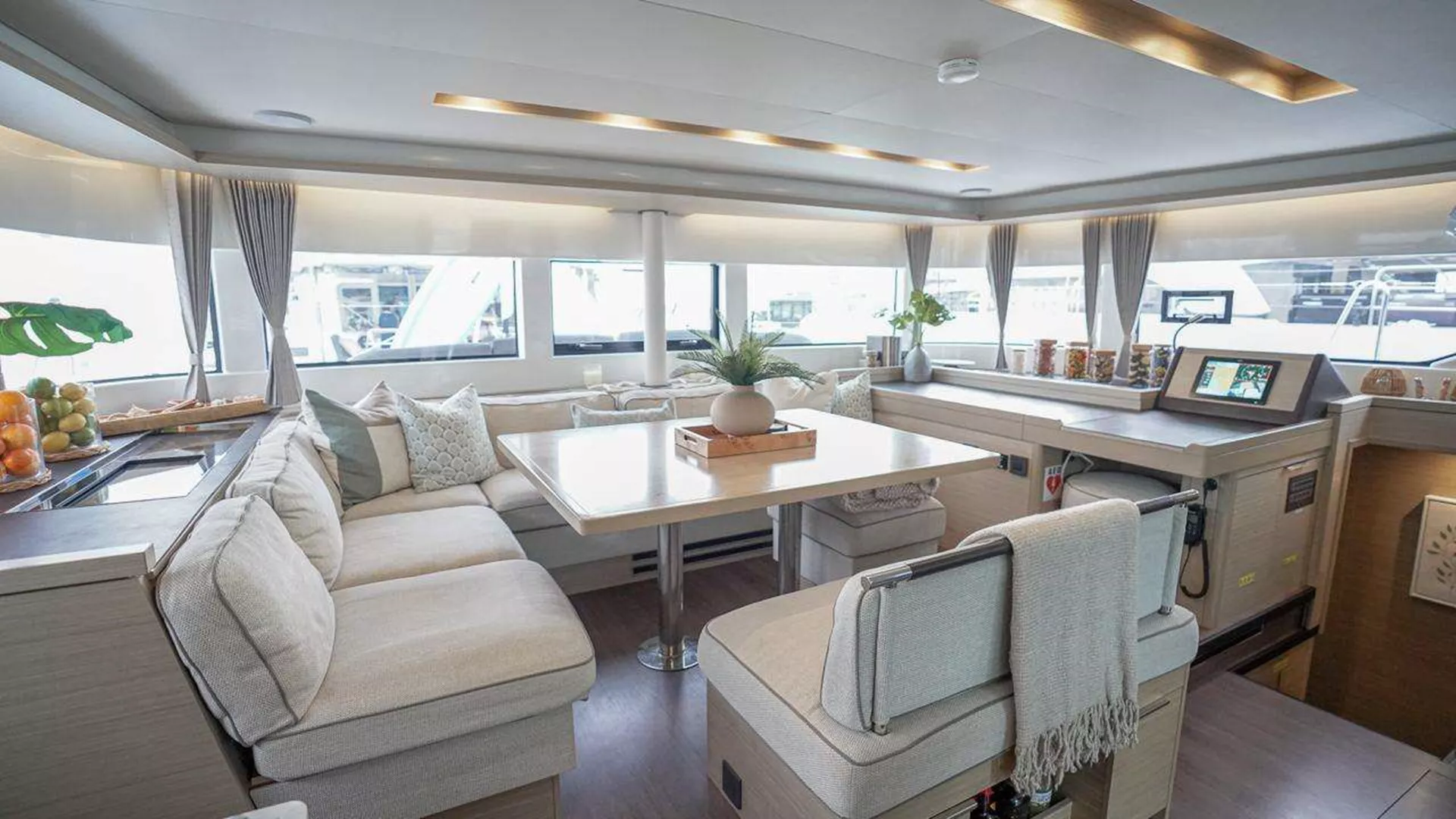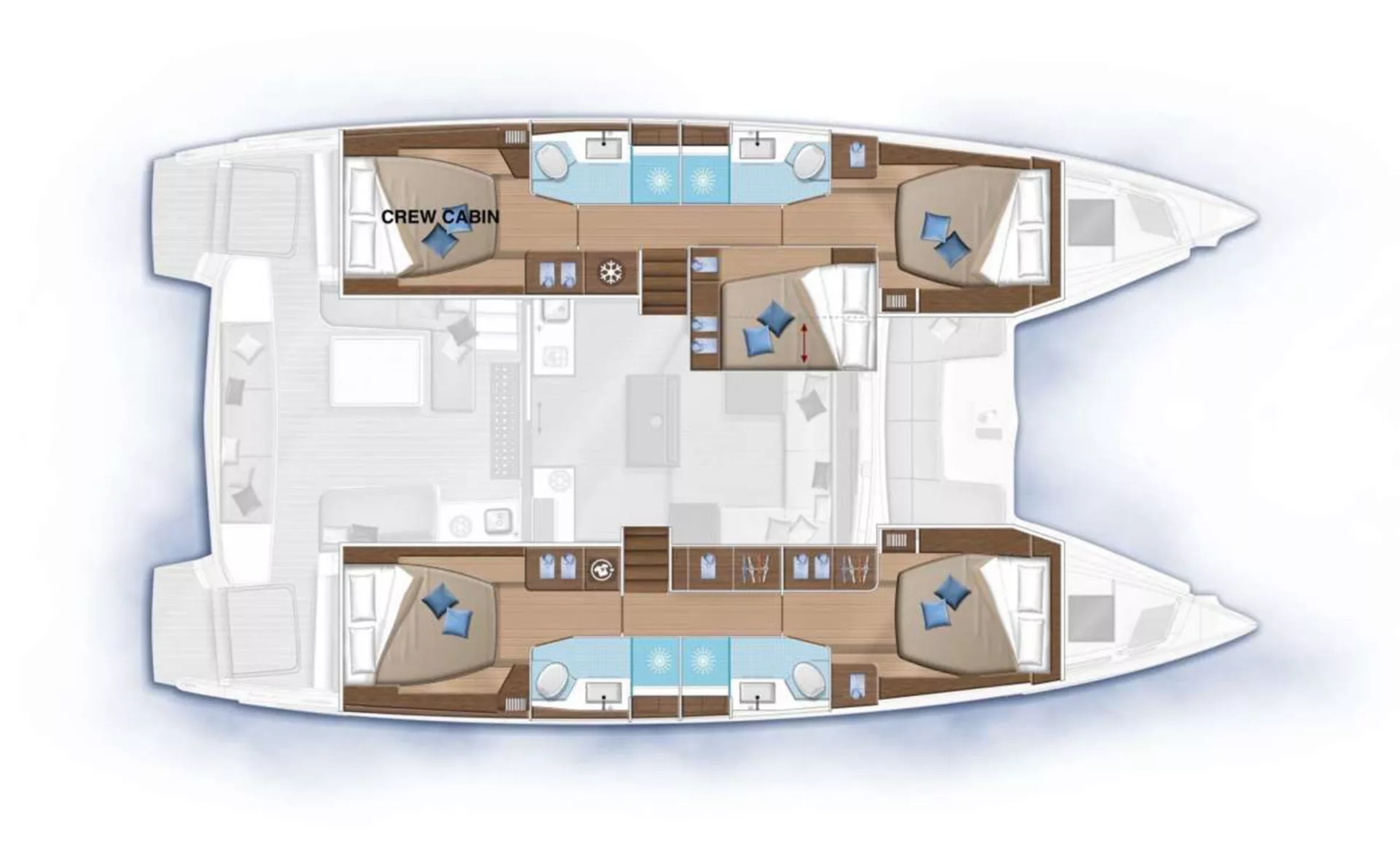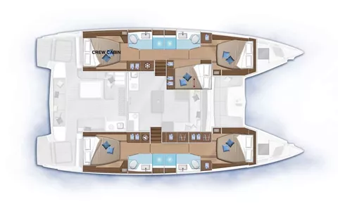 3 queen ensuite cabins and midship cabin are available to guests. Midship and port forward cabins share head. Crew will take port aft queen cabin.
