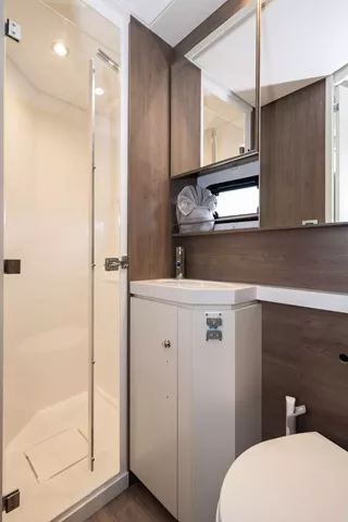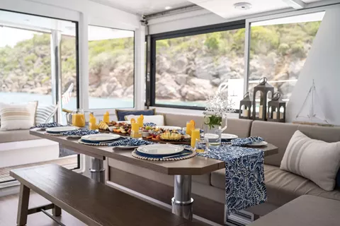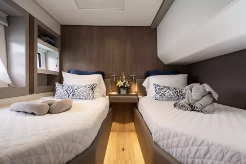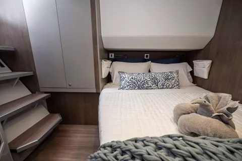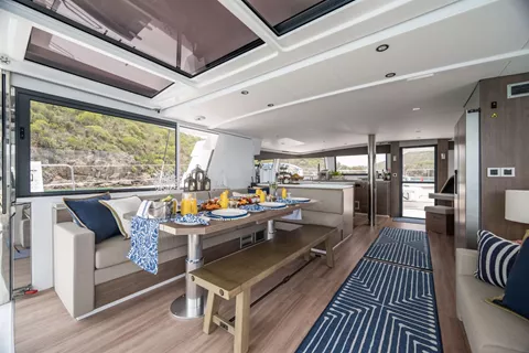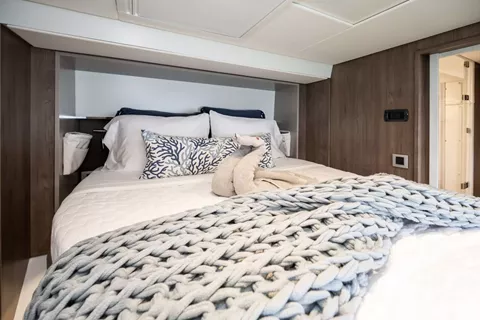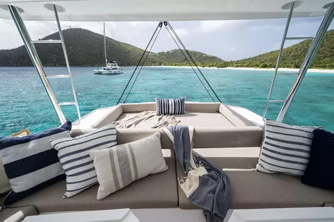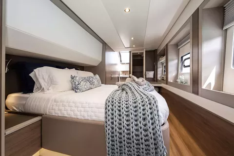 With her solid foredeck gone are the forward trampolines, replaced by a large relaxing lounge area complete with cushions for sunbathing. A full-sized door provides access directly from the lounge area into the salon, allowing free movement through the yacht. A walk up to the flybridge unveils a seating area perfect for cocktails and taking in sunsets. There is also another area for sunbathing on the flybridge where you can take in the sights of the islands from the highest vantage point on the yacht.