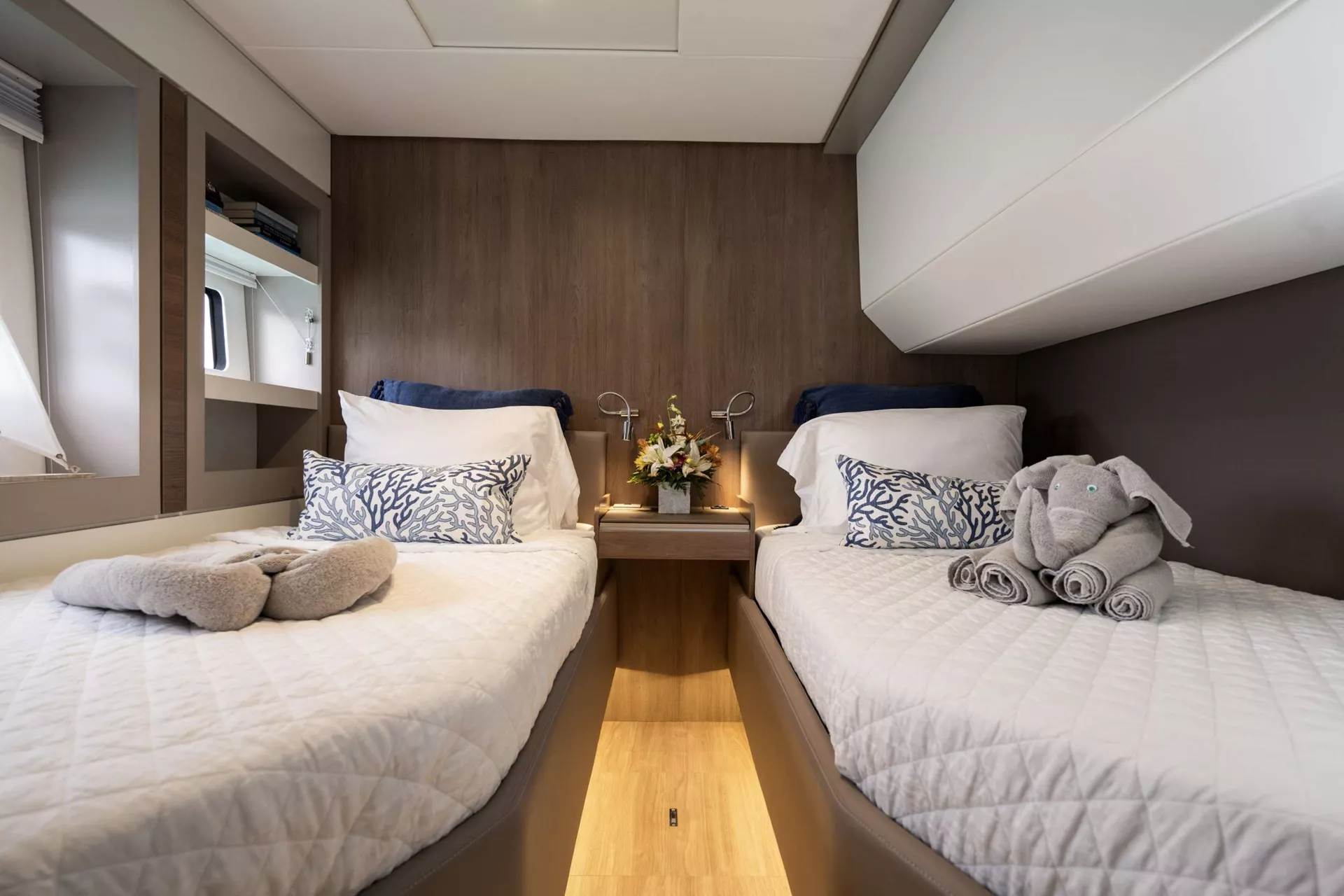 Crew take starboard mid-ship cabin (twin cabin), but will move to starboard aft cabin on request for $800 fee.