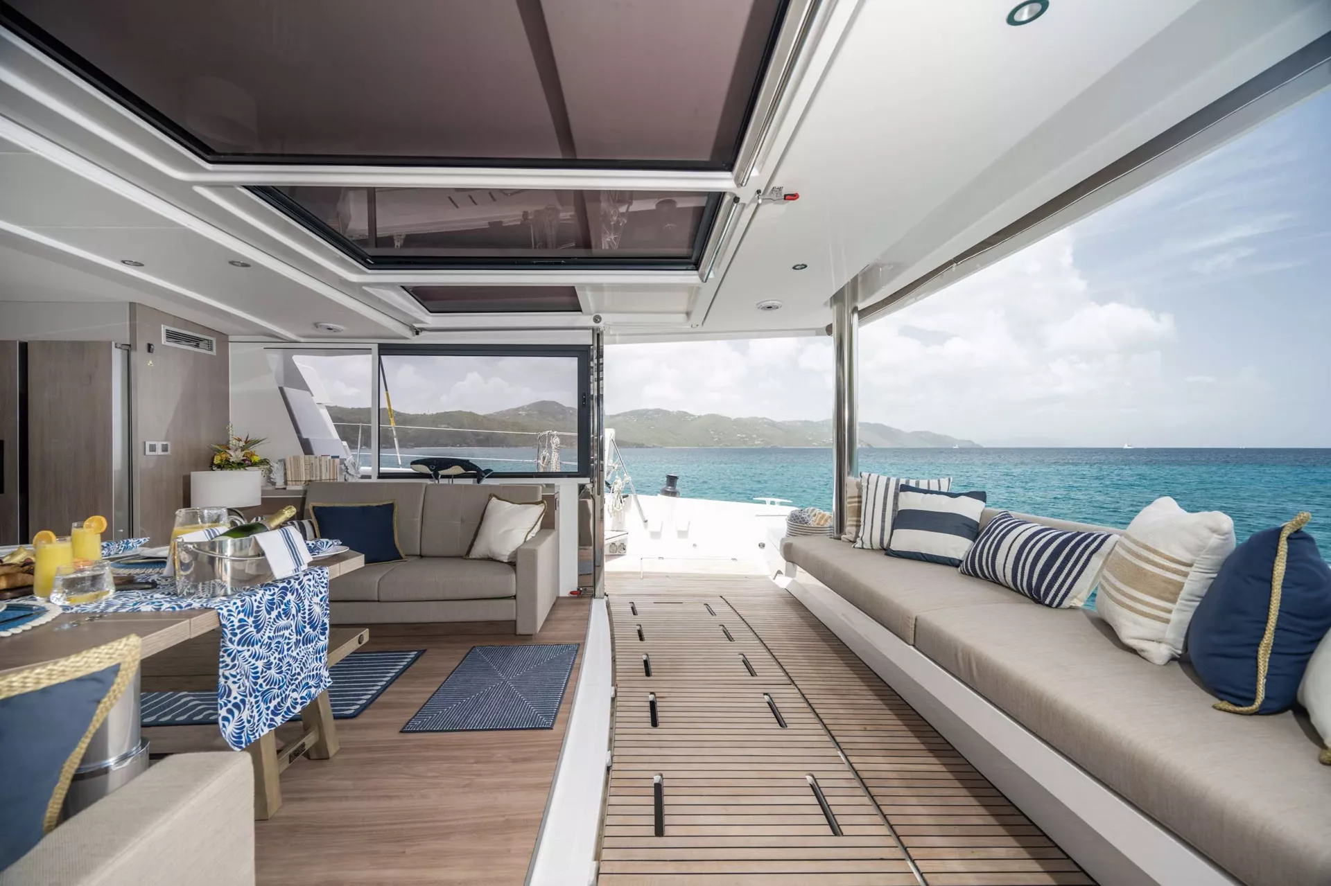 Bali catamarans are known and appreciated for their unparalleled success in blending luxury, space, and performance; producing a sailing experience that is unparalleled. This new design further capitalizes on that reputation with the advent of the “Bali garage door” that is the centerpiece of the yacht. It allows for the aft wall of the yacht to simply disappear, opening up the back of the yacht to an unobstructed view of paradise. This also affords indoor/outdoor dining options and gives the ever-present Caribbean breeze ample opportunity to make its way through the yacht with ease.