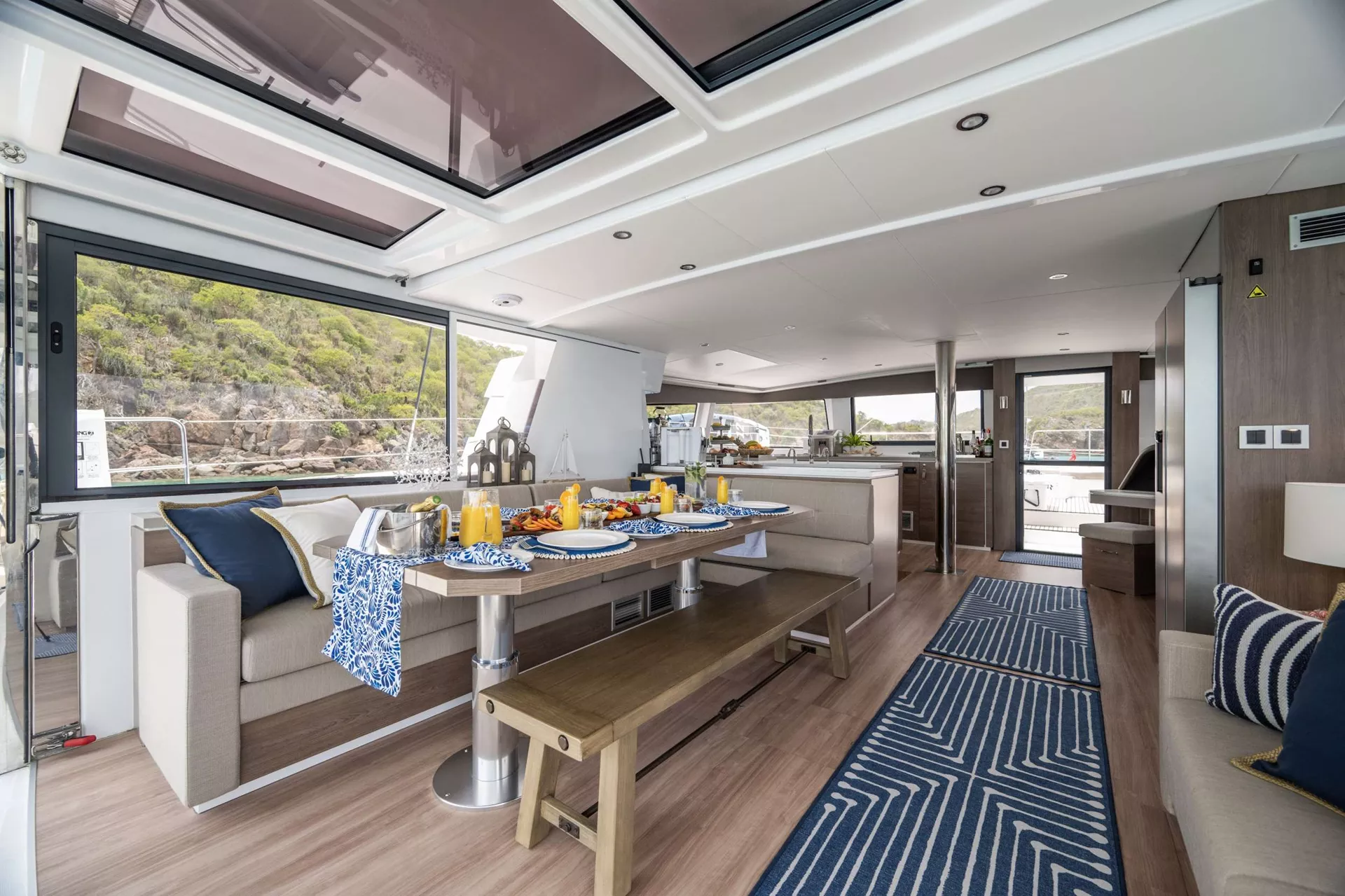 Main deck has a bright and airy main salon (fully air-conditioned) as the galley direct access to the forward cockpit lounge area.