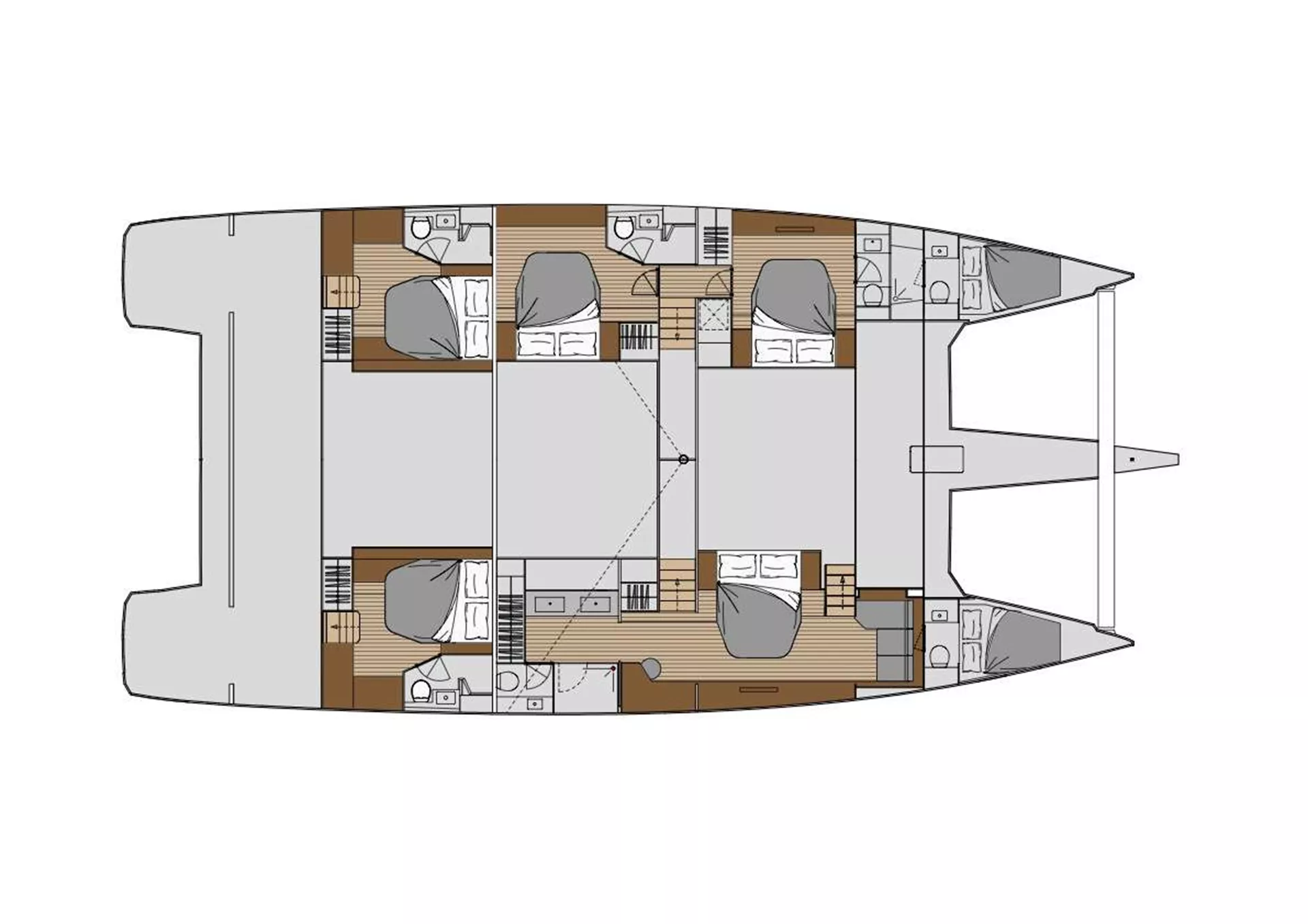 One master cabin with queen size bed (size between queen and king bed), 4 double cabins with queen size beds all with private facilities.