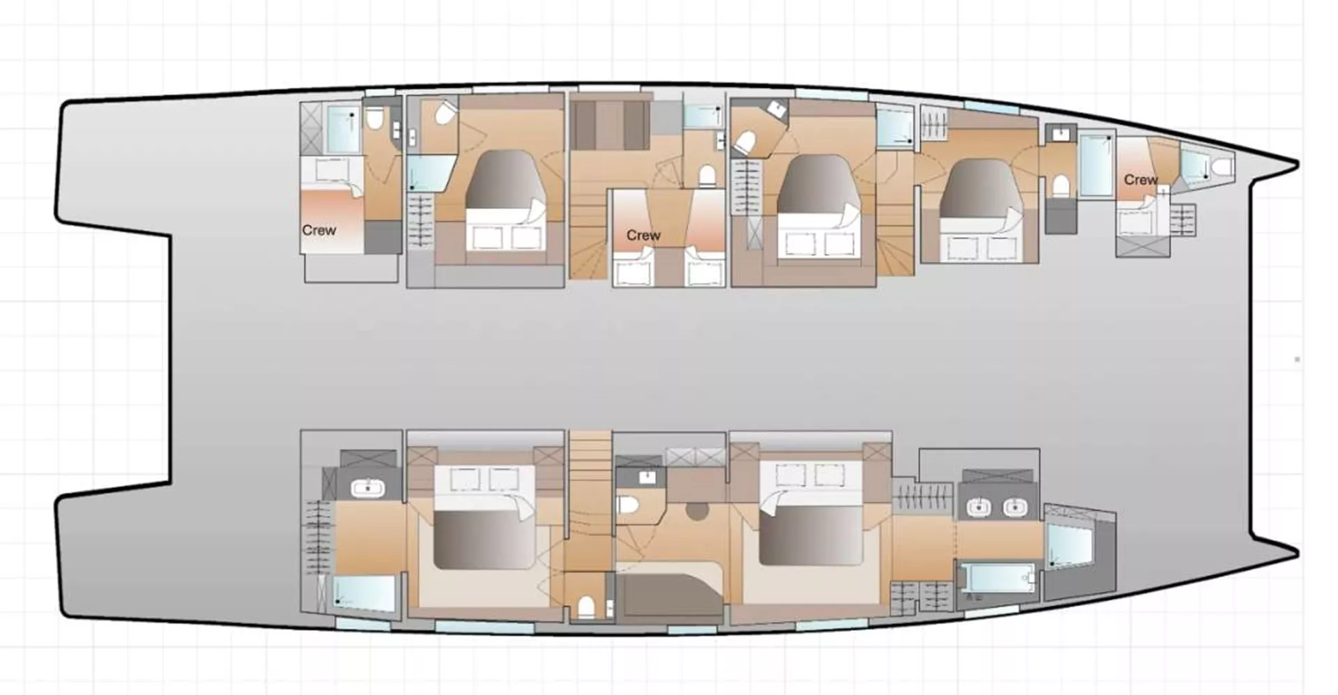 One owner's suite with jacuzzi bathtub and separate shower (bed size 1,80 m x 2,00 m, 32 m²), one VIP cabin with desk area (bed size 1,80 m x 2,00 m, 22 m²), and three queen bed cabins (bed size 1,60 m x 2,00 m, 14 m² approx.), all with private facilities.