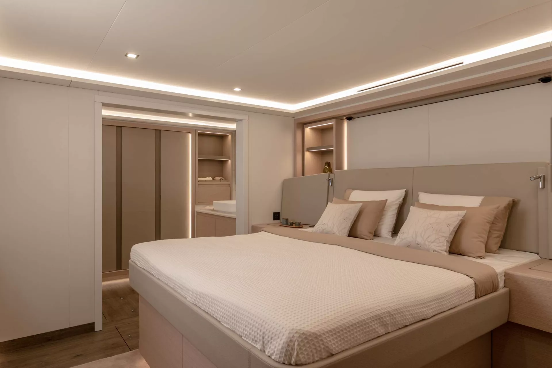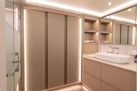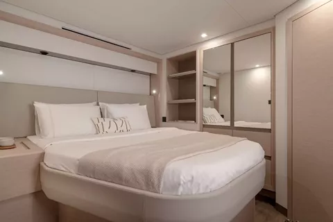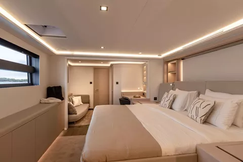 The yacht’s impressive flybridge serves as a true ocean lounge, featuring generous seating, sunbeds, and 360° views—perfect for relaxing under the sun or enjoying the thrill of sailing. At the bow, the forward cockpit with bar and jacuzzi provides another inviting space to unwind, ideal for morning coffees, sunset cocktails, or quiet moments surrounded by ocean views. Step inside to discover a bright, ultra-modern interior where comfort and elegance come together effortlessly. SERENISSIMA III accommodates up to 10 guests in five beautifully designed cabins, including a spacious master suite, a VIP cabin, and three queen cabins. Each features its own ensuite bathroom, ensuring complete privacy and a boutique-hotel level of comfort throughout your stay. With the galley up, the guests are invited to observe the chef creating unforgettable dishes adapted to each preference.