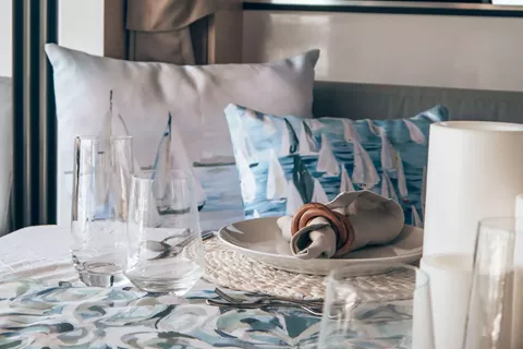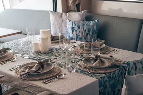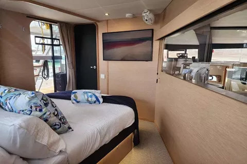 Neptune’s Escape hosts up to 8 guests in 2 queen-sized and 2 double , air-conditioned cabins. The master cabin has an ensuite bathroom. The starboard master cabin is elegant, roomy and features a lavish multilevel design. The ensuite bathroom takes up almost the entire starboard hull featuring a full queen-sized cabin on the main level. The ensuite bathroom has a shower and separate vanity area below. The master suite also has direct private access to the main salon.