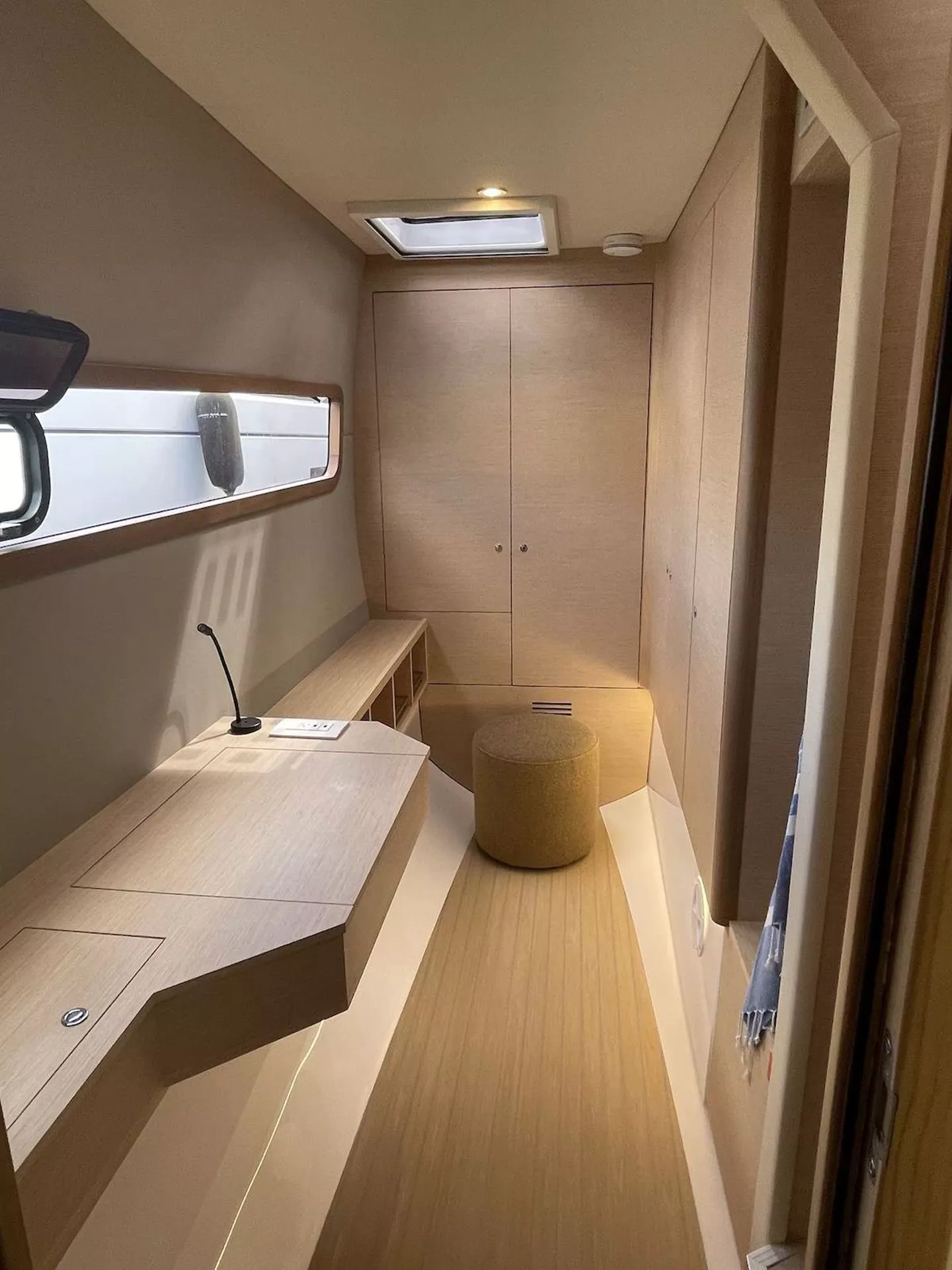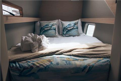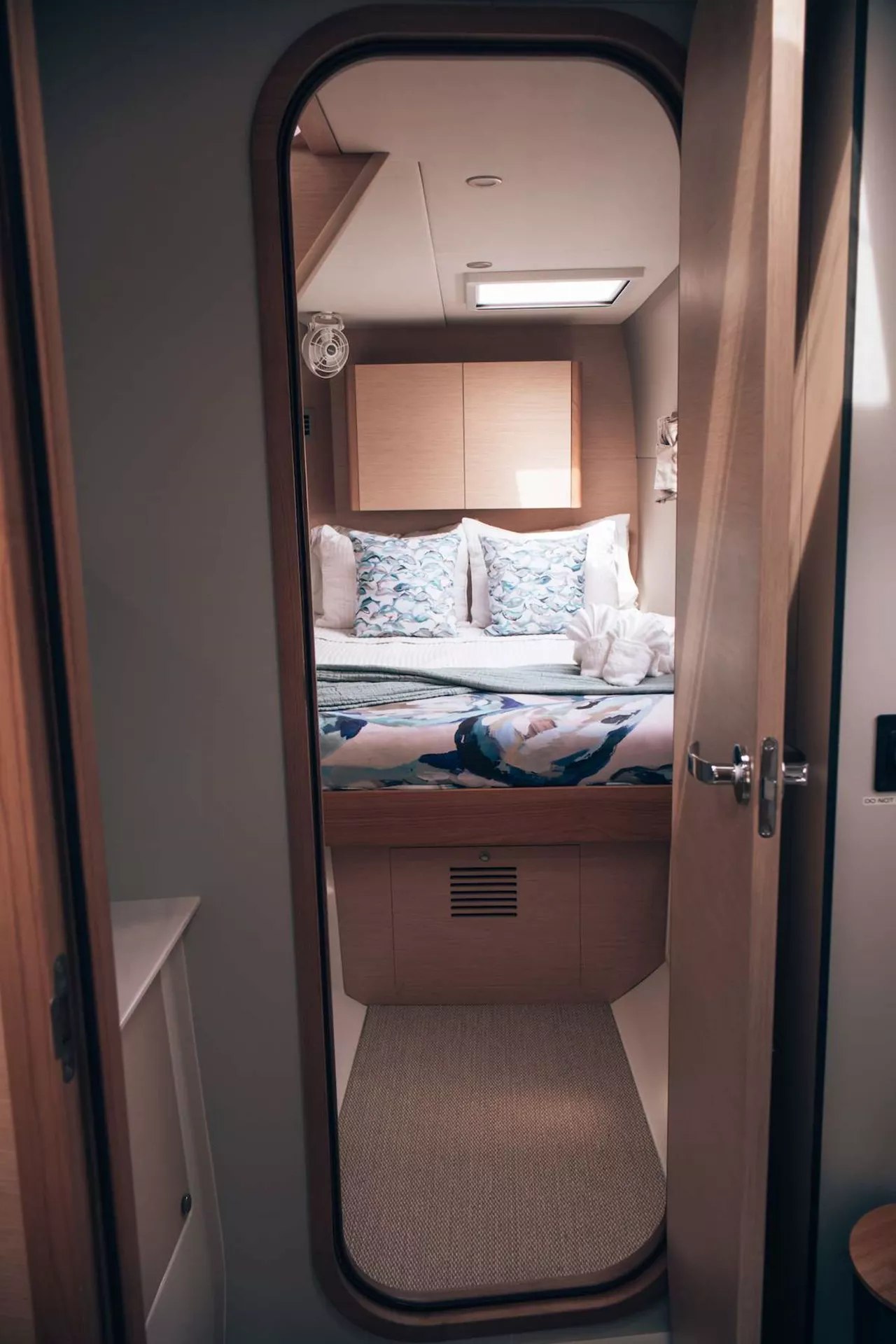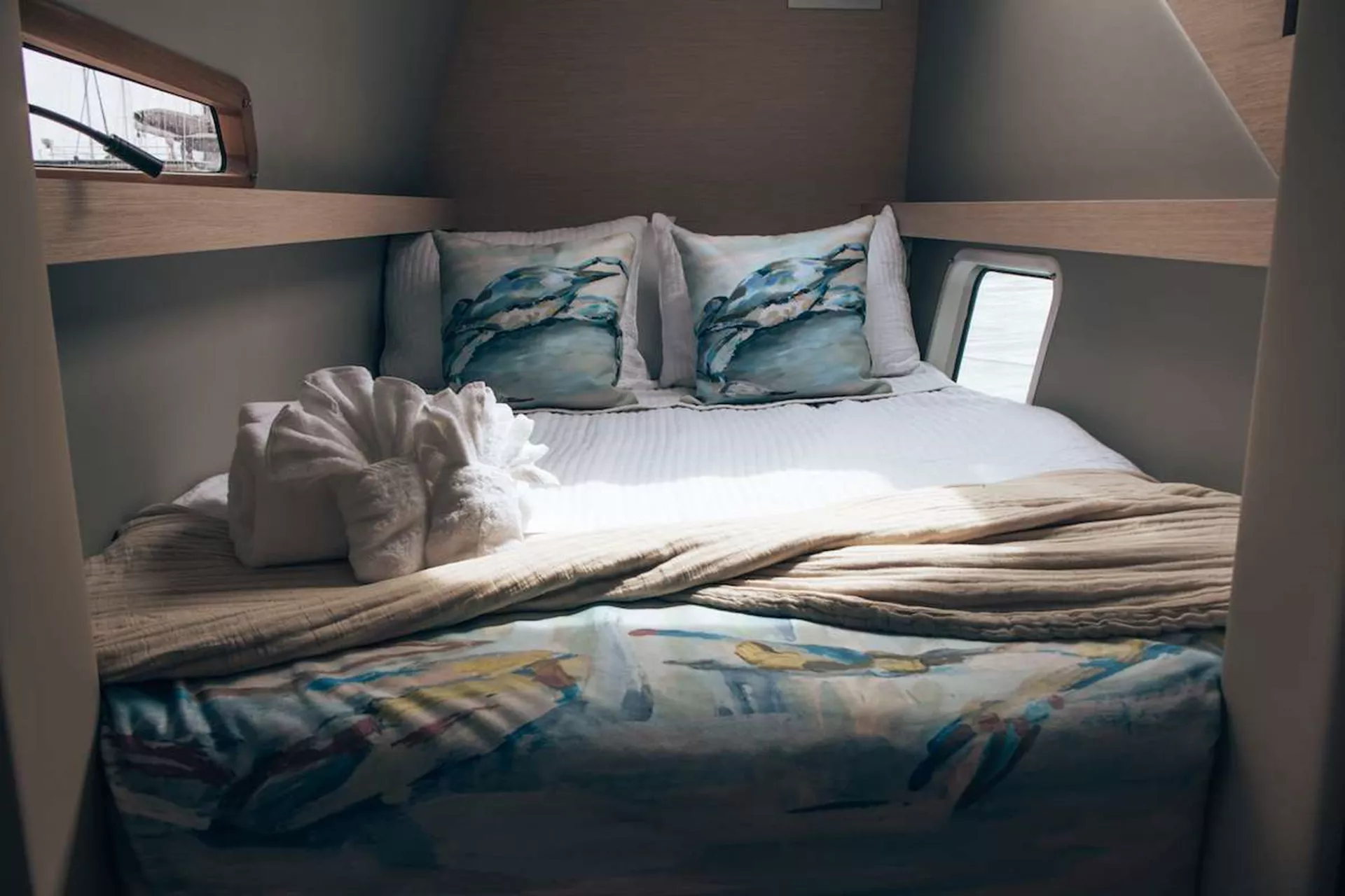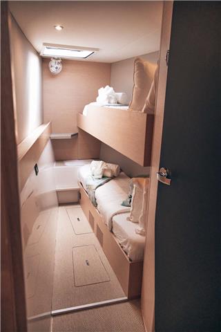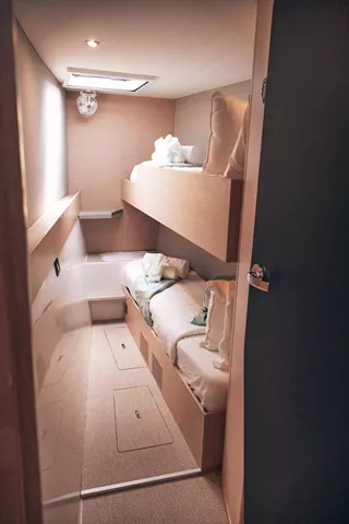 The crew occupy the bunk room which is forward in the middle hull. The crew share the bathroom with the midships queen cabin and have their own door to the bathroom.