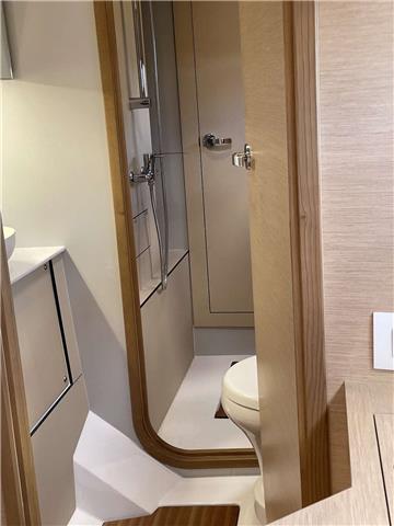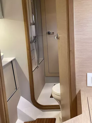 Two double cabins are in the port hull with a shared Jack 'n Jill bathroom. This is a wet head.