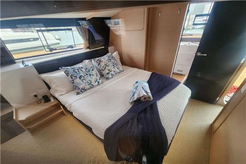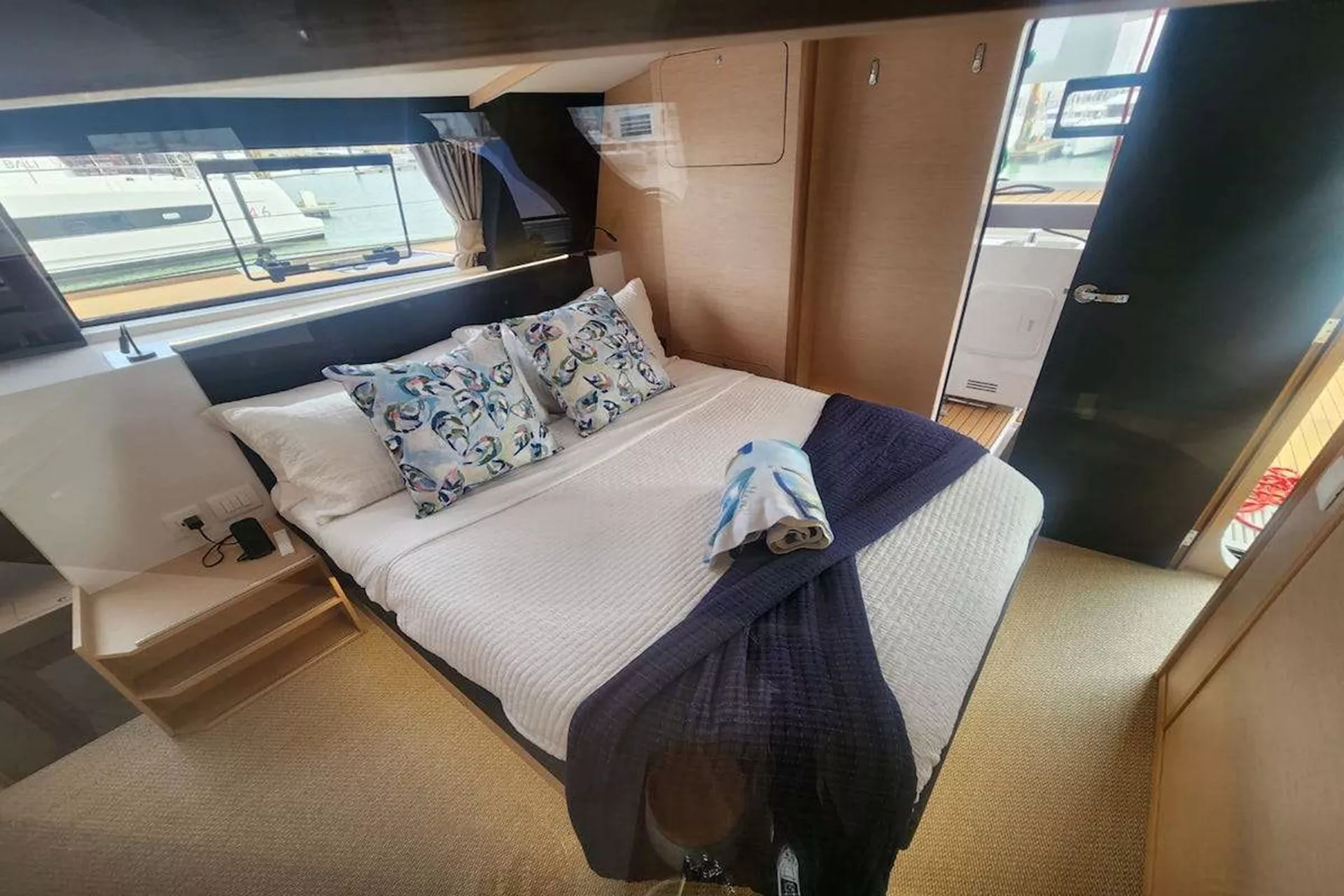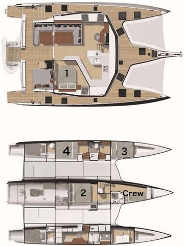 This trimaran has 2 queen cabins (1 x center hull and 1 x master cabin) and 2 double cabins (2 x port side hull). Crew occupy the bunk room (center hull)