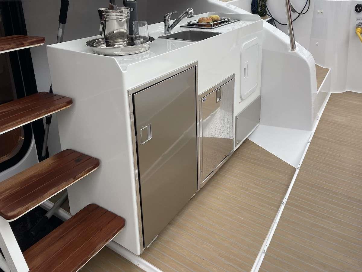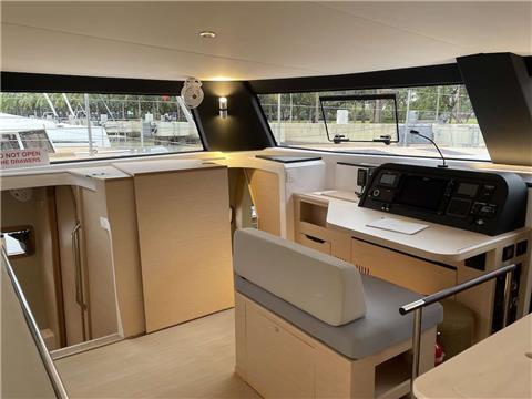 The large open concept salon living area seamlessly melds with the cockpit via a large sliding door system that provides wide panoramic views of the beautiful surroundings while reaffirming a highly functional freedom of movement throughout the yacht.