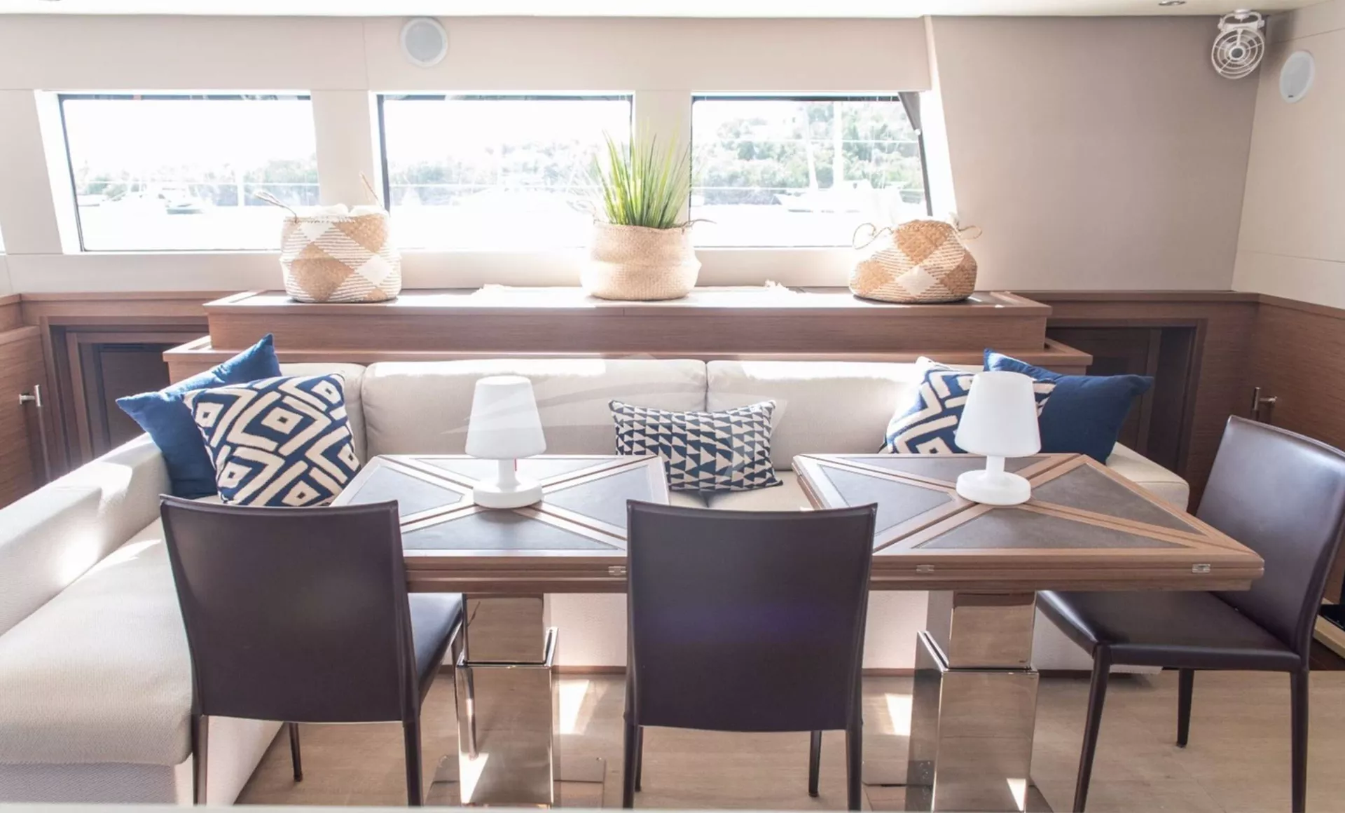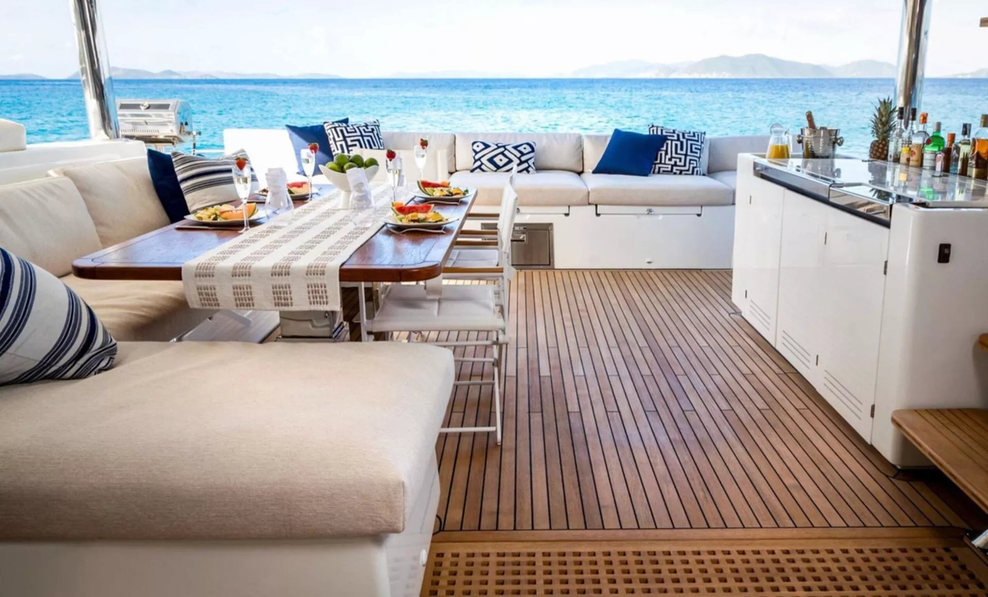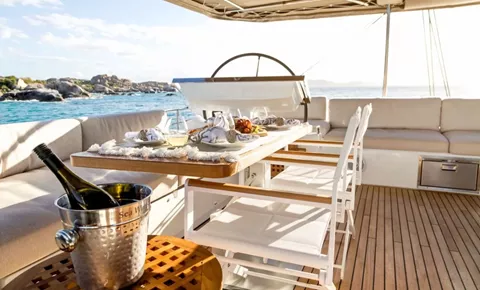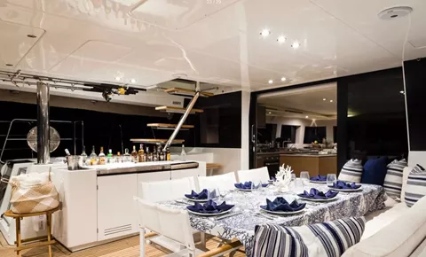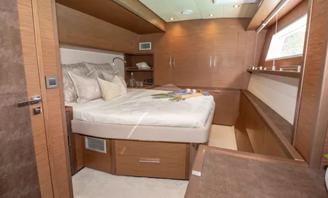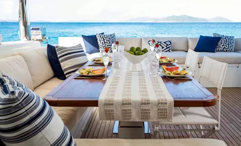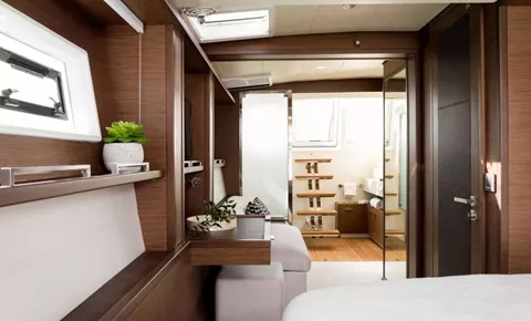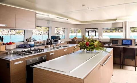 The social heart of the yacht is the stunning open galley, turning every meal into a gourmet theater where your chef prepares fresh delicacies in full view. This connects seamlessly to the salon, finished in a soothing color palette with panoramic windows that flood the space with natural light.