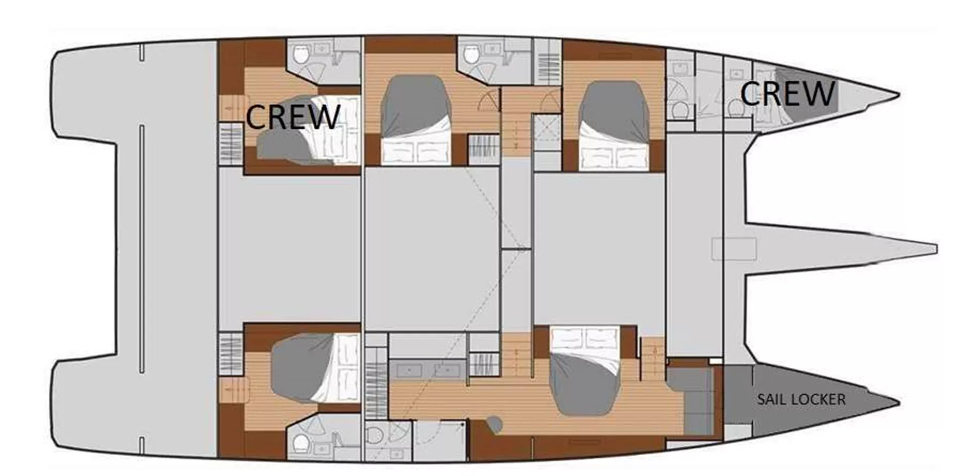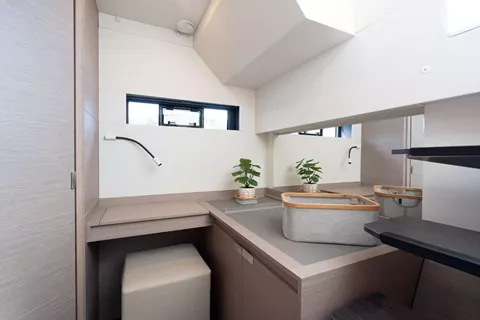 Modern and Spacious Interior: Step inside and be greeted by a striking modern interior that feels both expansive and inviting. Imagine sleek lines, high ceilings, and ample natural light flooding through large windows. Four luxurious cabins, including an owner's suite and three queen-sized cabins, each with its own private bathroom, promise peaceful retreats after a day of adventure.