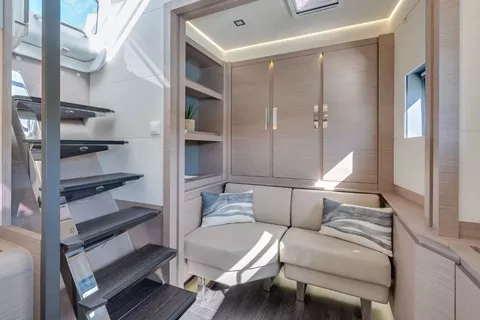 Expansive Flybridge: Imagine a spacious flybridge, like a private oasis perched above the ocean. Picture plush, decadent lounges and sunbathing beds beckoning you to sink in and soak up the sun.