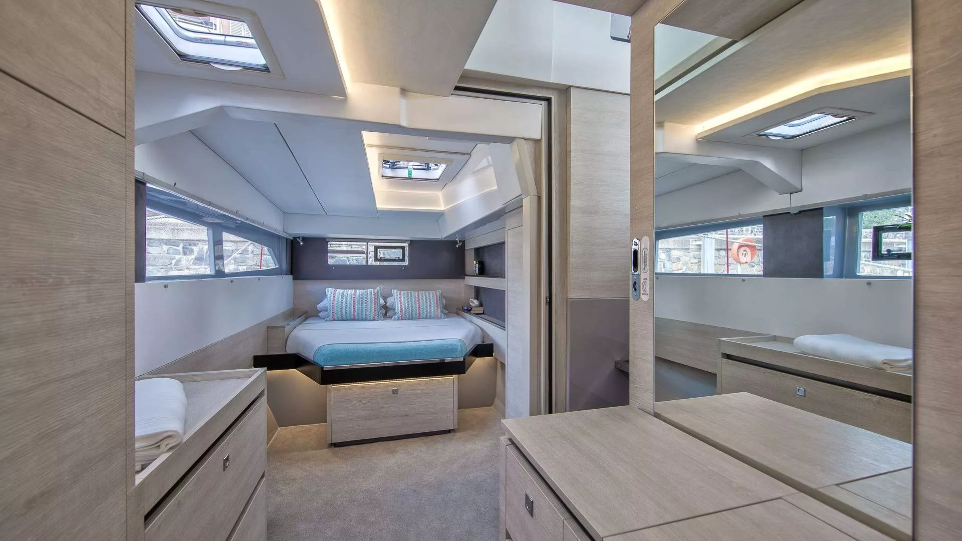 Step into the salon and discover an open-plan living space designed for ultimate enjoyment. The salon’s panoramic windows and sliding doors seamlessly connect to the cockpit, creating a fluid indoor-outdoor environment. A striking feature is the forward door leading directly to the foredeck, where you can bask in the sun or enjoy the expansive trampolined area. This easy access to the foredeck enhances your experience of the open sea and fresh air.