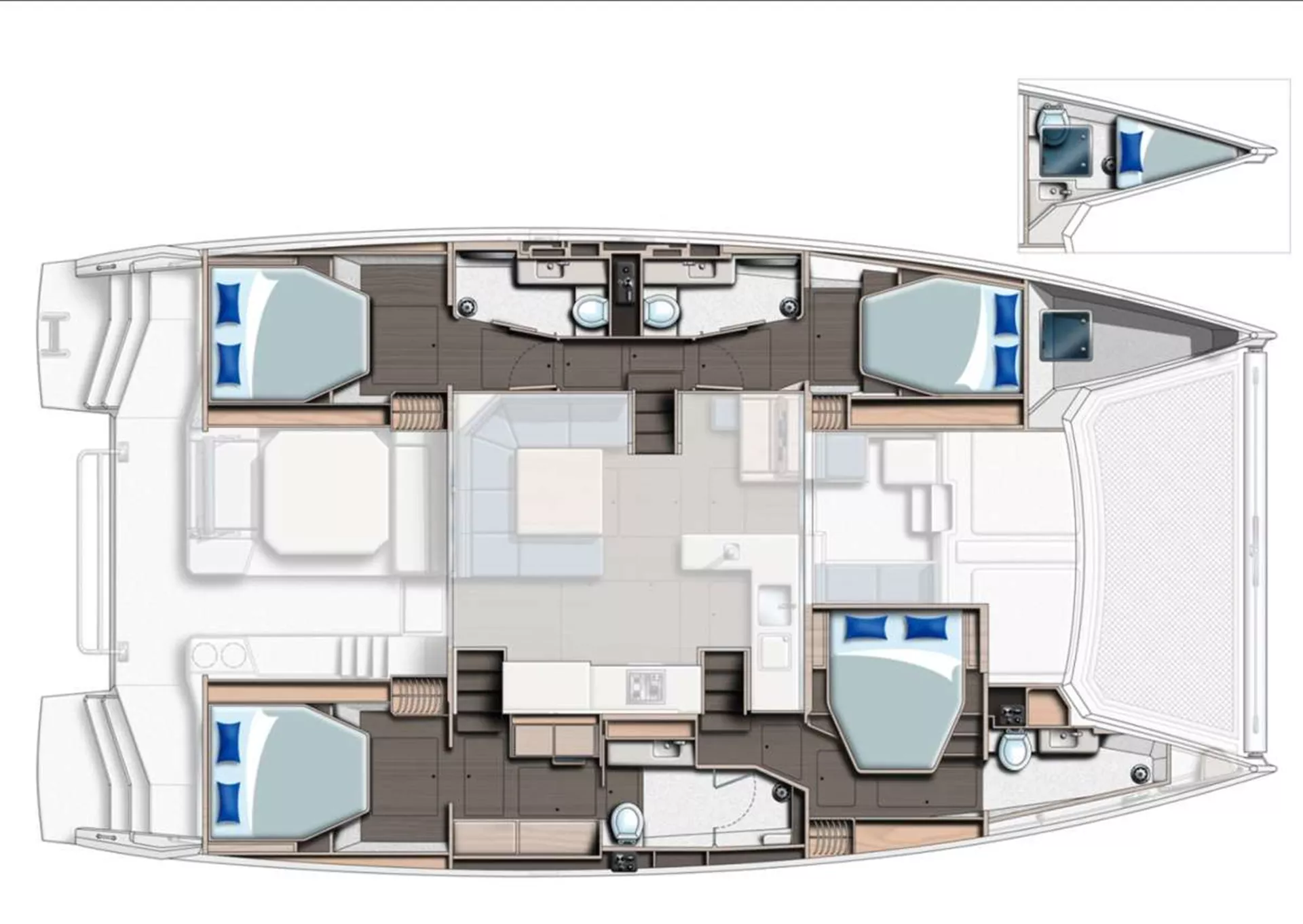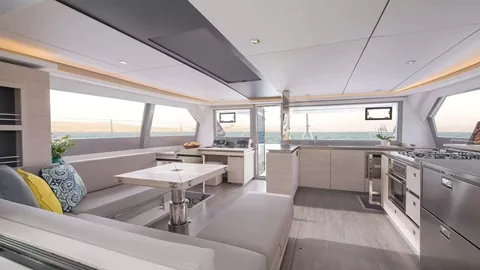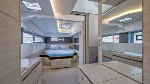 The Leopard 50’s design includes three sumptuous queen cabins, each thoughtfully crafted to provide an oasis of relaxation. The master cabin, located in the starboard hull, is a masterpiece of elegance and spaciousness. It features a lavish island bed, expansive storage, and panoramic windows that frame breathtaking views of the horizon. The en-suite bathroom is a sanctuary in itself, equipped with modern fixtures and a separate shower, ensuring every comfort is catered to.