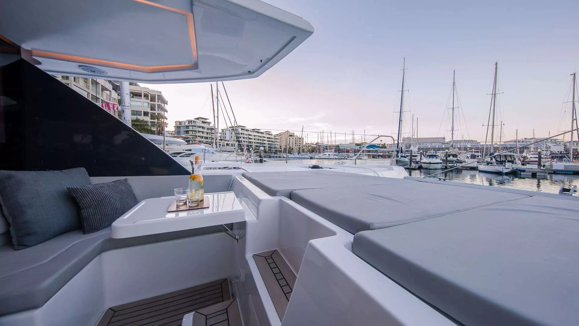Foredeck includes lounge area with cocktail table and trampolines.