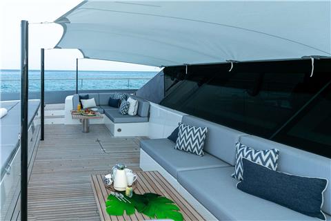 BLESSED offers a spacious and luxurious feel normally only found aboard Motor Yachts of the 130’ range. The open main salon, with galley up layout, creates a friendly and inviting atmosphere. Perfect for relaxing and socializing. The aft deck, with seating for up to 10, is ideal for memorable alfresco dining and conversation. It is complimented with an ice maker, 2 refrigerators and chilled filtered water for your convenience.