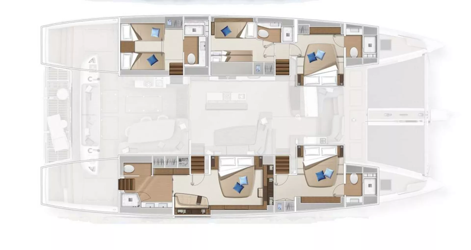 Master + 2 double cabins with queen beds, + 1 twin cabin (beds can be together as a queen or separate as 2 singles). Crew has midship port double twin (bunk) cabin
