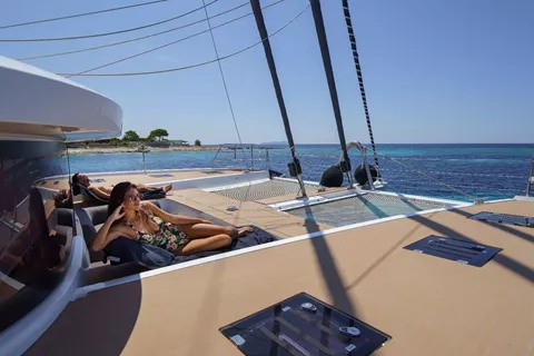 Paloma’s salon comprises a spacious galley, a comfortable dining table, and a spacious and luxurious lounge area. On the foredeck, enjoy the terrace with a large area for sunbathing and socializing, including sunbeds, comfy sofas, and coffee tables.