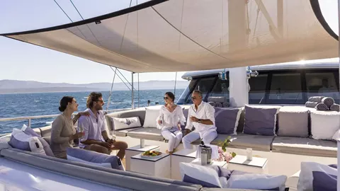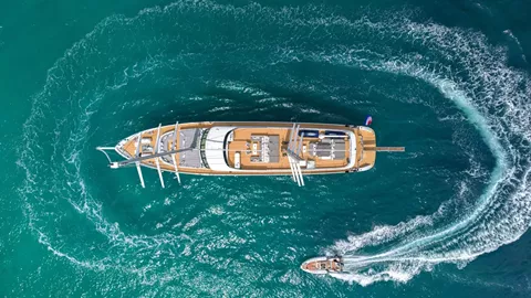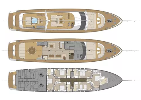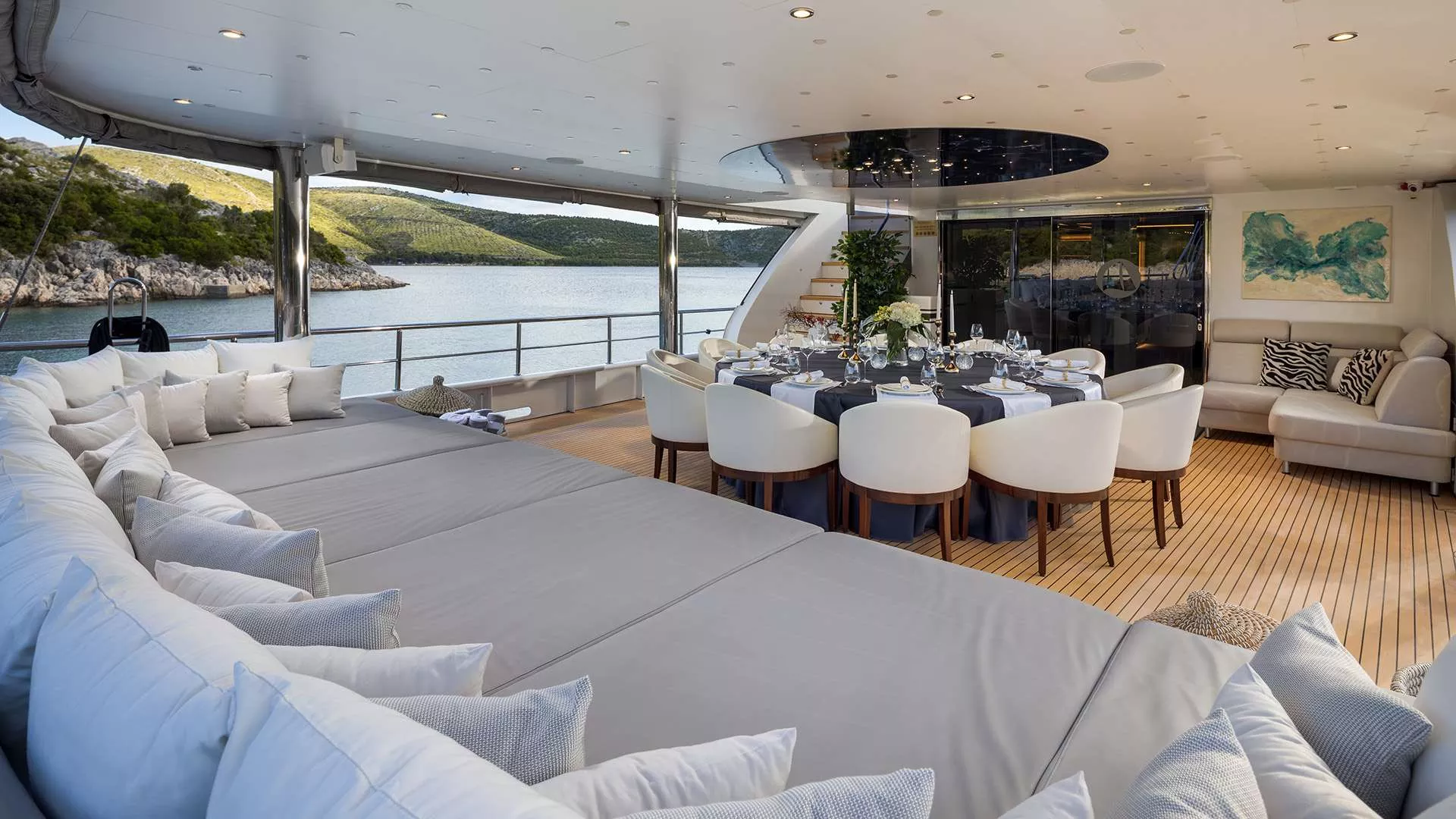 The elegant lounge extends to the stern dining area with a table for twelve, altogether nearly 100 m2. The flybridge of 120 m2 comprises a sunbathing area and a Jacuzzi to immerse you in relaxation and stunning vistas.