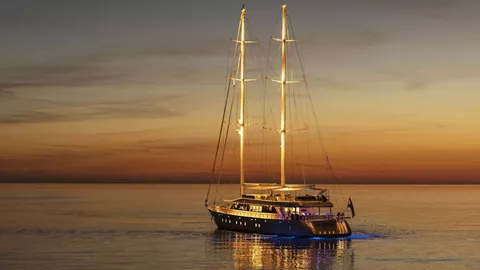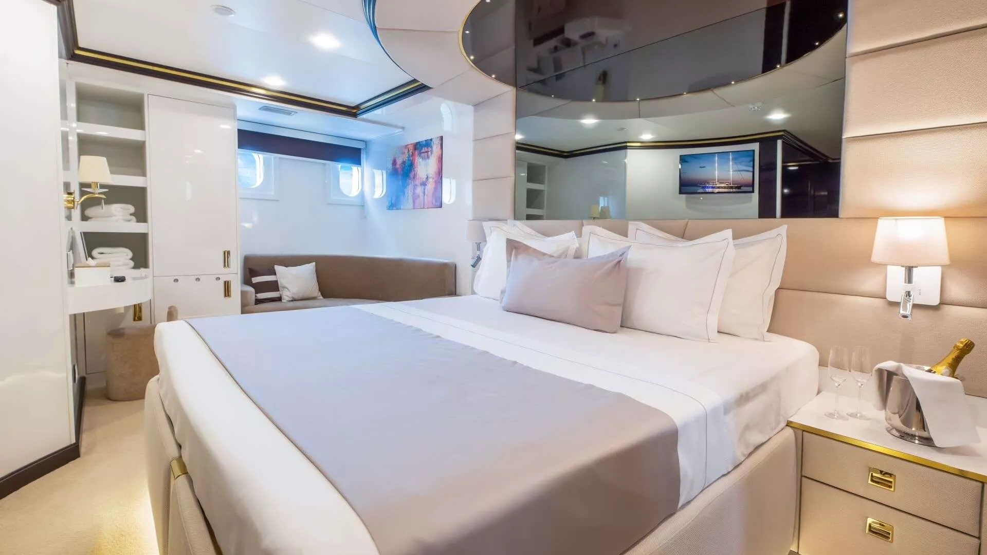 Launched in May 2020, this new luxury crewed motor sailer is available for charter along the stunning Adriatic coast, appointed central agency. Aurum Sky is by all means, a unique yacht on the charter market. At 43.5 meters, she offers expansive space in all areas. She accommodates up to 12 guests in 6 double en suite cabins. The cabins range in size between 20 m2 and 25 m2, and two can be converted to twin cabins. Equipped with a Smart TV/DVD, fridge, safe, Intercom, WiFi Flat 3G/4G, and with room service on option, the cabins allow for an entire private and personalized guest experience.