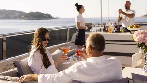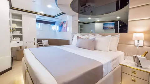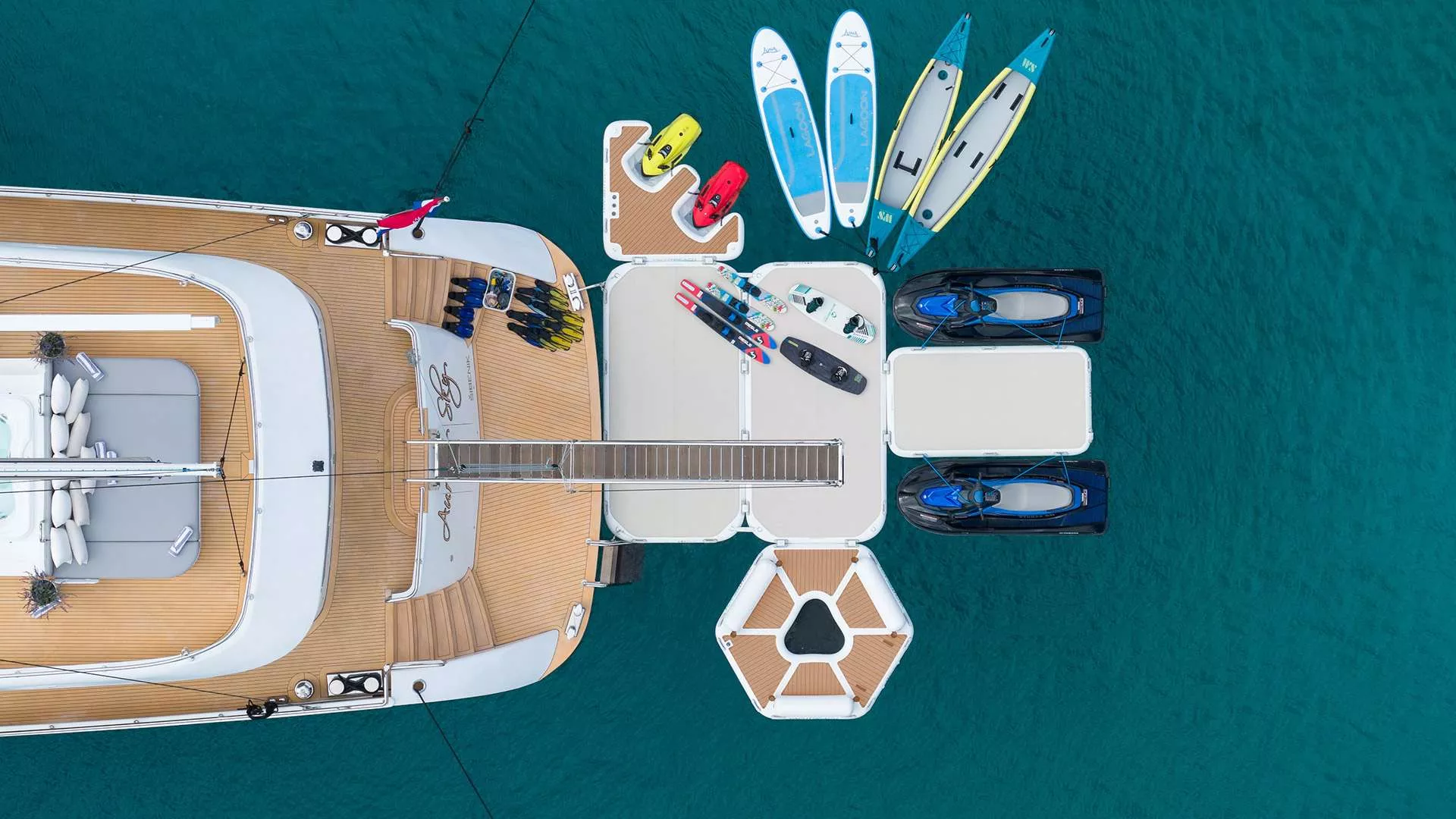 Aboard Aurum Sky, all your daily rituals are bound to be even better! Find a large Smart TV, DVD, USB iPad/iPod/mobile docking station in the saloon, while the upgraded sound system links to the flybridge and cabins. Read your press in the library, get business done efficiently in the privacy of the office. And for action and adrenaline, Aurum Sky packs a plethora of the top-notch water toys and equipment such as two jet skis, 2 Seabobs, adult and junior water skis, SUPs, fishing equipment, kayaks. More toys are available as extras.