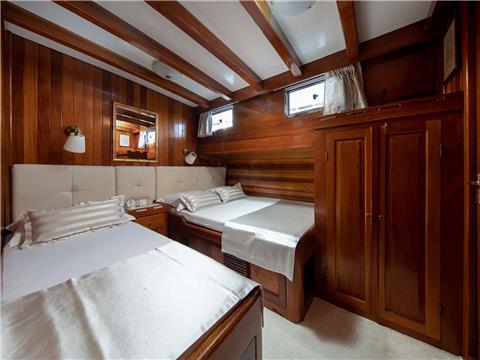 Master cabin (15 m2 incl. bathroom) with double bed (150x200 cm). Private bathroom with shower box and home-type toilet.