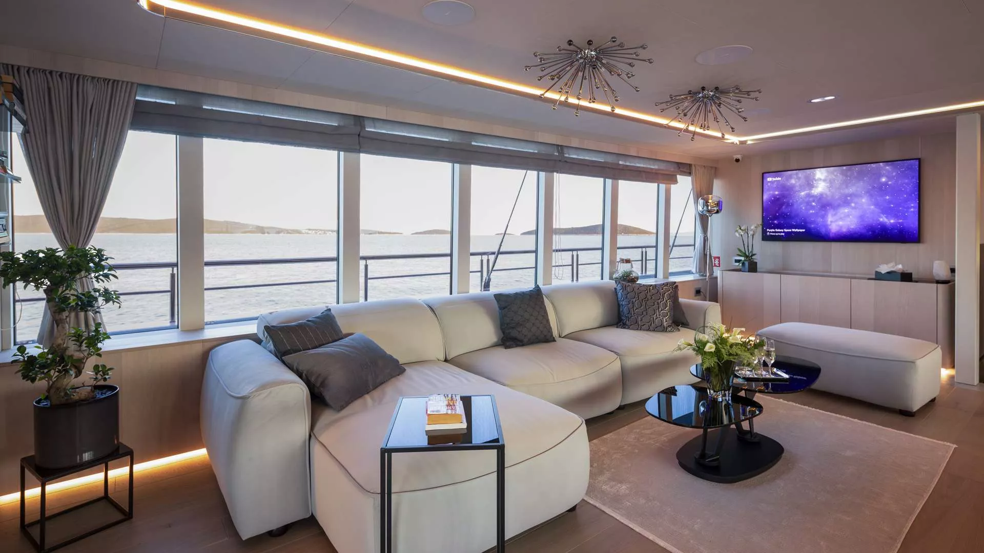 With an eight-person Jacuzzi and huge sun loungers, the sundeck is the perfect place to soak up late-afternoon sunshine with a glass of bubbly in hand. Covered with sun tents, the sundeck doubles as an open living room that can host sunset cocktails, themed parties, as well as start-lit movie nights, with the screen mounted on the mast. The gym equipment can be moved from the lower deck gym to the sundeck, so you can reap the benefits of sea air while exercising.