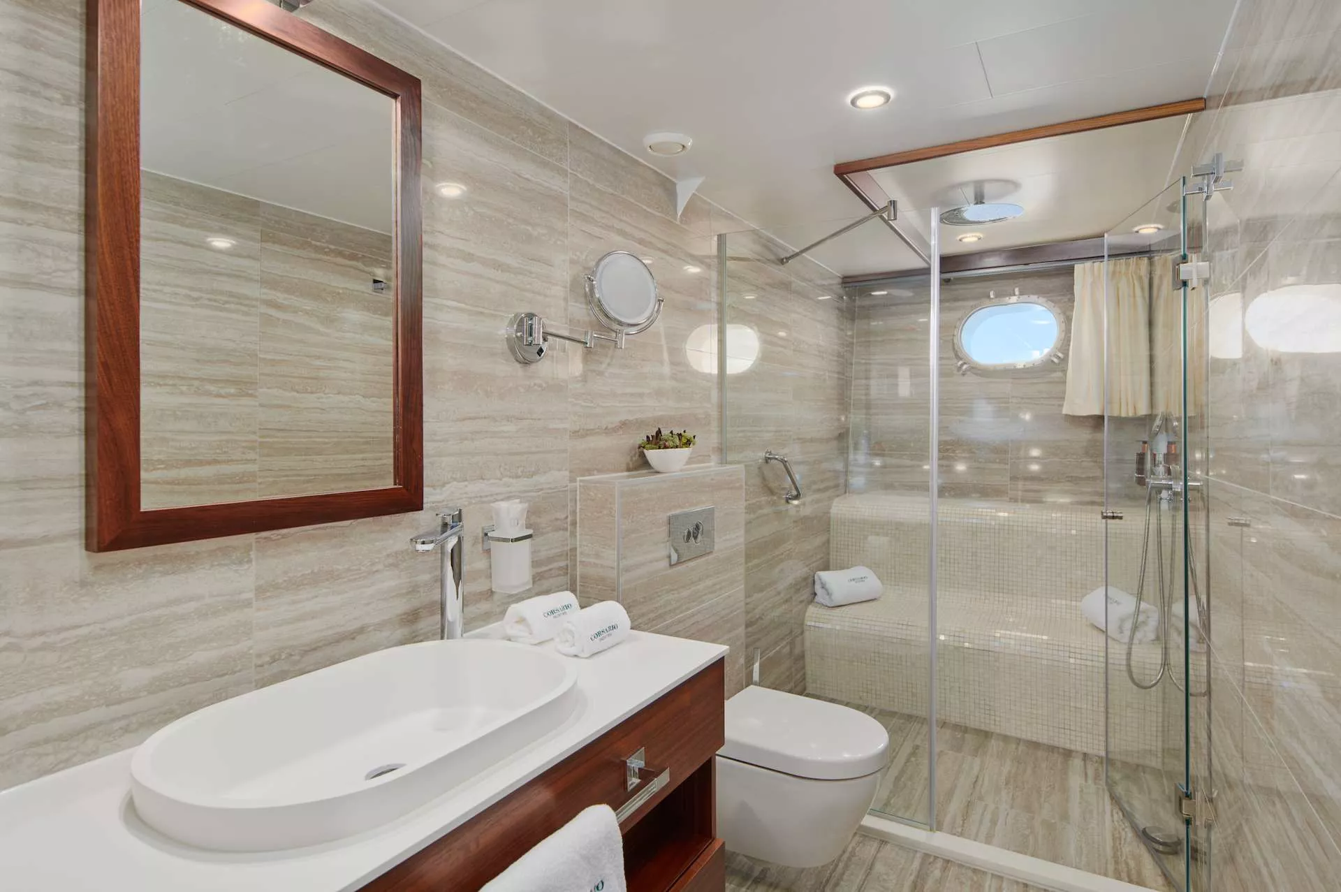 Yacht CORSARIO offers accommodation for up to 12 guests in six staterooms: one Master cabin, one VIP cabin, two double cabins and two twin cabins. There is also another en suite single cabin, the seventh cabin, on the top deck. This is a slightly smaller cabin, but can be used for groups that might want to maximise the available space. This cabin is also a great option for those clients that want a masseuse or a full-time nanny onboard. Each cabin comes with A/C, flat screen TV, wi-fi, safe box, audio surround system with separate controls and room service.