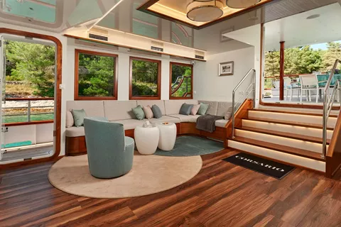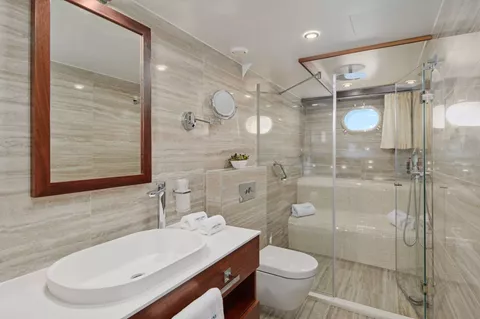 There is also another en suite double cabin, the seventh cabin, on the top deck. This is a slightly smaller cabin, but can be used for groups that might want to maximise the available space. This cabin is also a great option for those clients that want a masseuse or a full-time nanny onboard.