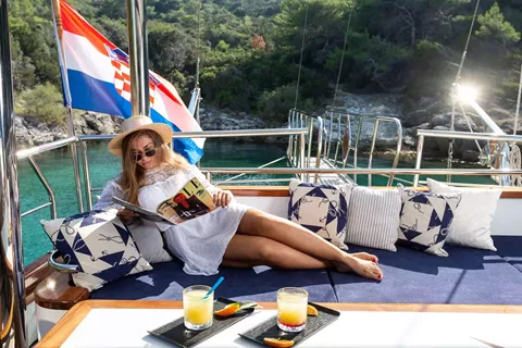 - all inclusive alcohol package: includes Croatian quality wines, beers, spirits, soft drinks, natural and mineral water, coffee, tea, juices. Foreign spirits: whisky Red Label or Jameson, rum Bacardi or Captain Morgan, gin Bombay or Tanqueray, vodka Absolute or Smirnoff, tequila Sierra or similar: 360 € pax/week