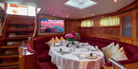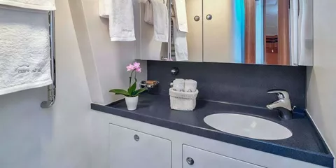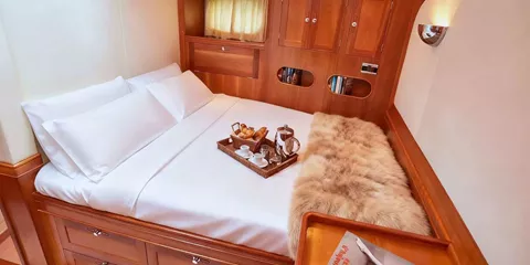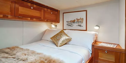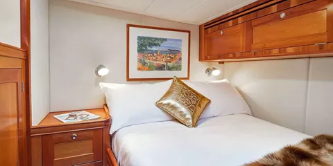 DARK STAR OF LONDON accommodates up to 10 guests in 5 elegant and harmonious cabins. The master suite is around 12 m2, full beam of the yacht forward with a double bed, seating area and has full-size en-suite shower room. Aft of the master on port and starboard are 2 mirror image doubles and 2 twin bunk cabins, around 7 m2 each and each has en-suite head compartment.